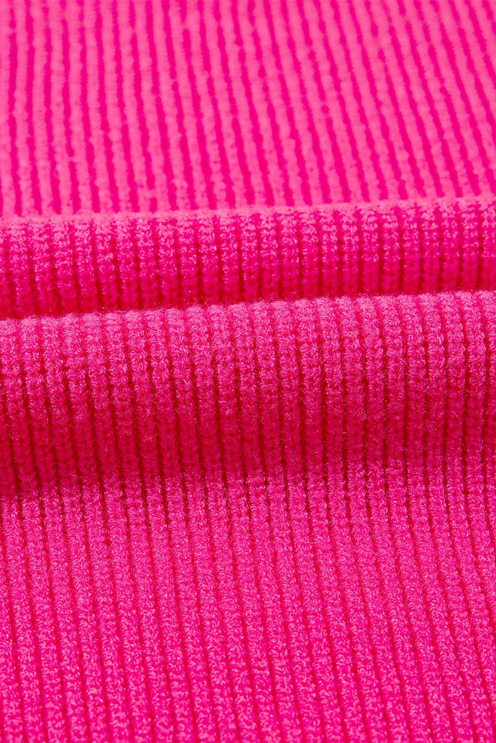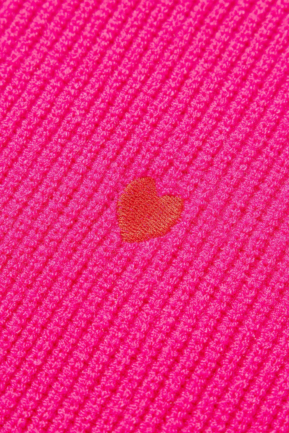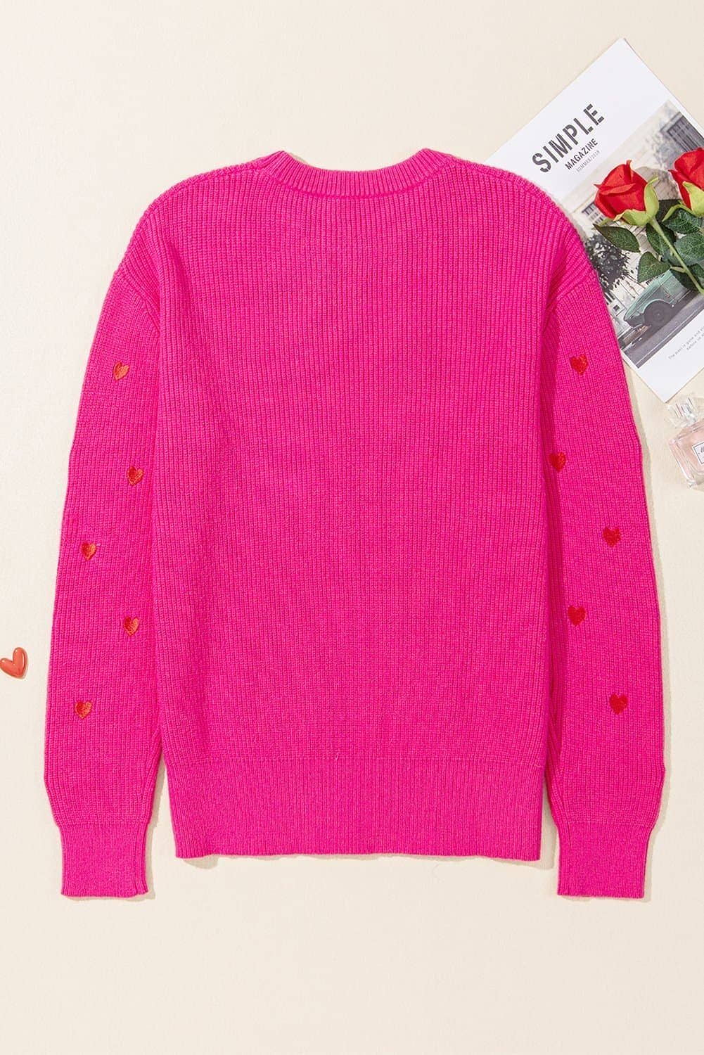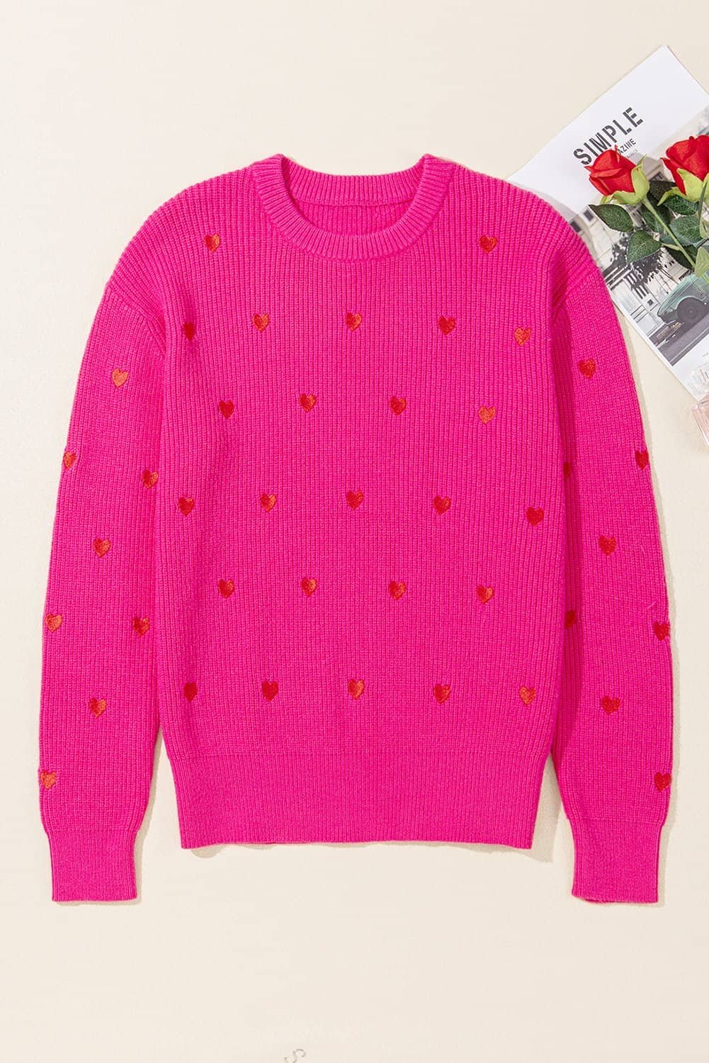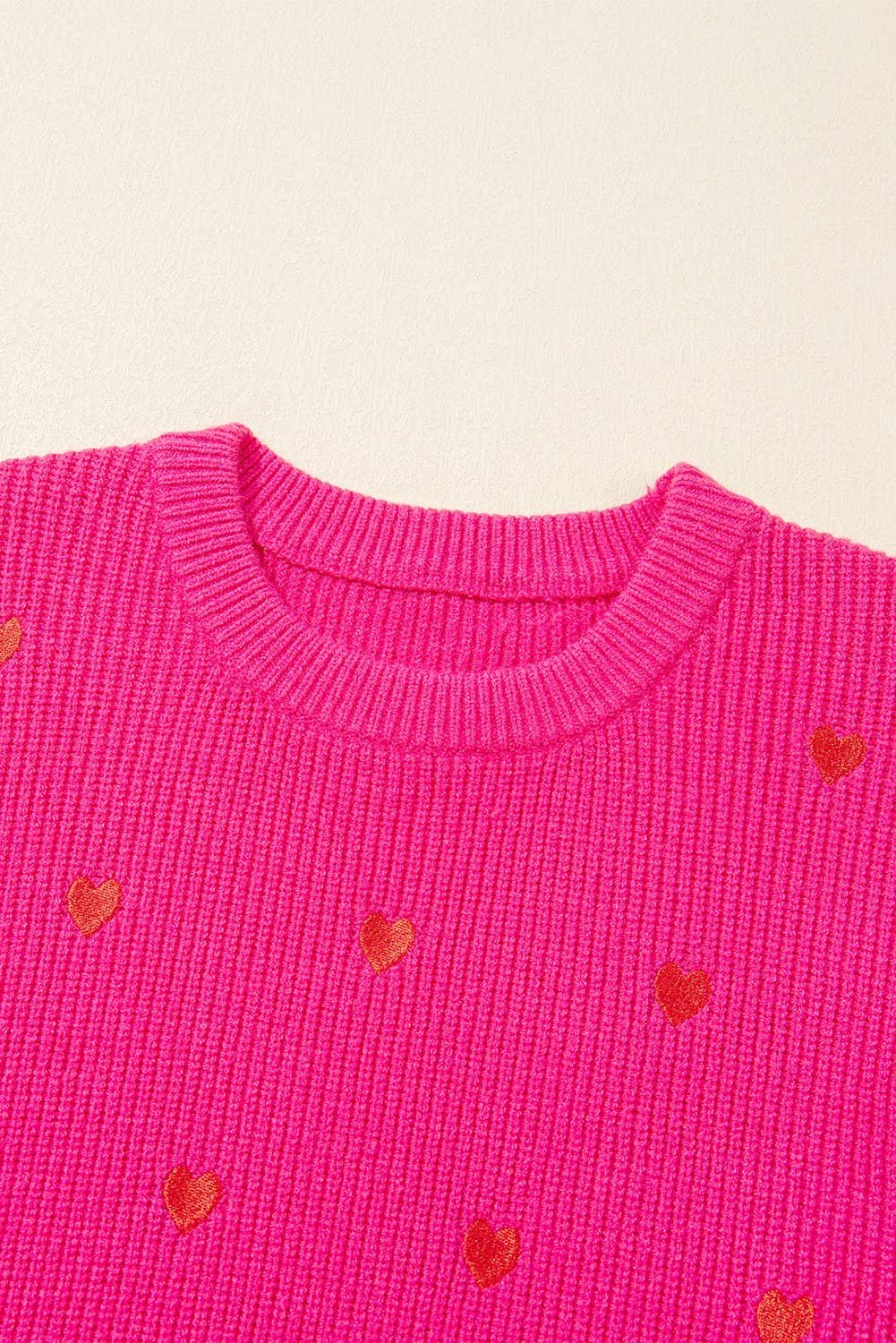 - This knit sweater features a ribbed texture and a red heart pattern.