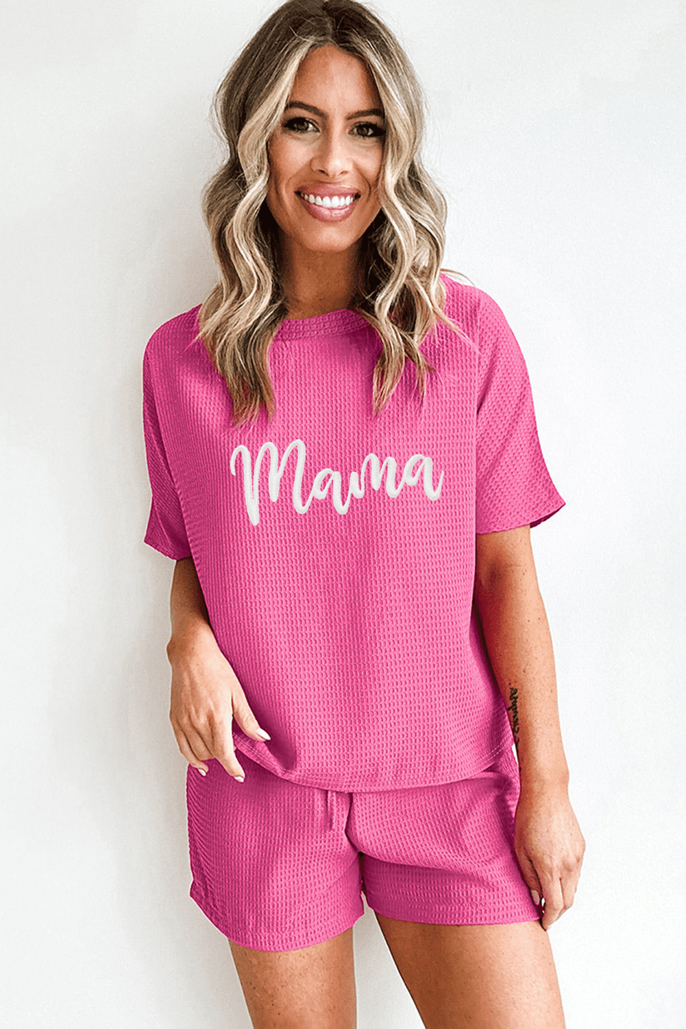 Rose Red Waffle Mama Embroidered Tee And Drawstring Shorts