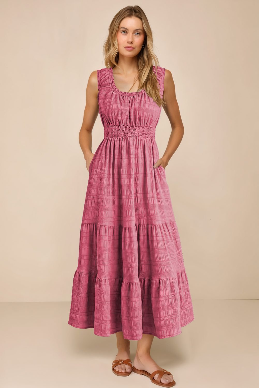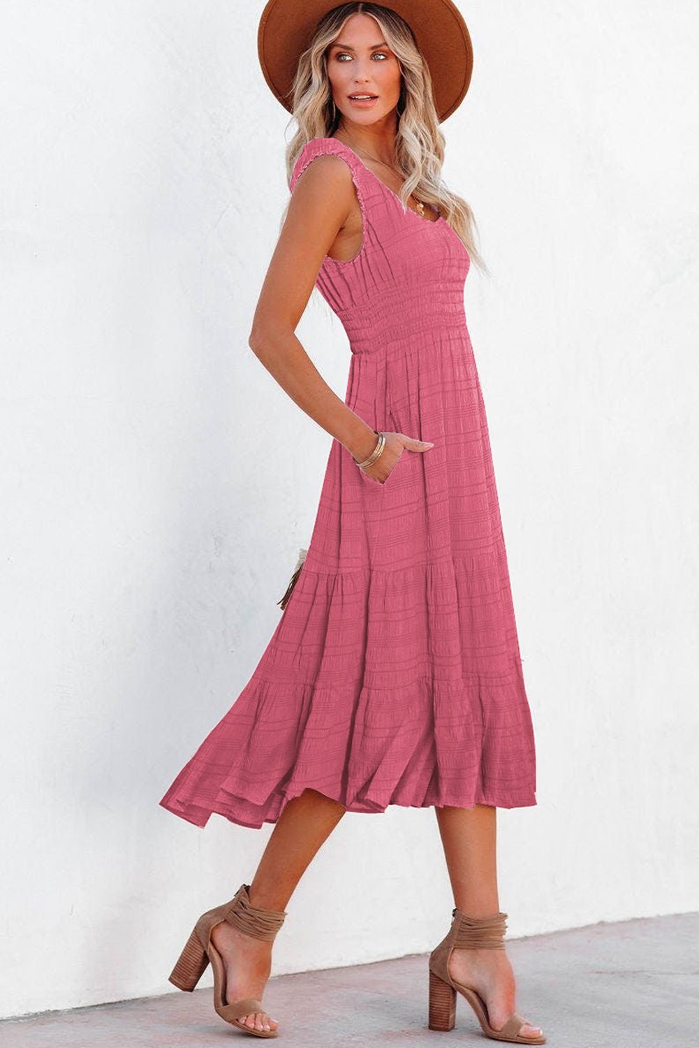 Rose Shirred Pleated Square Neck Sleeveless Midi Dress