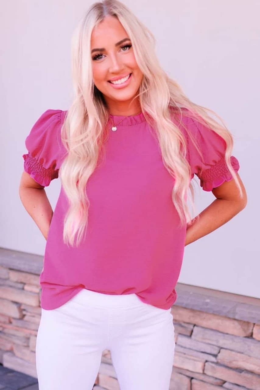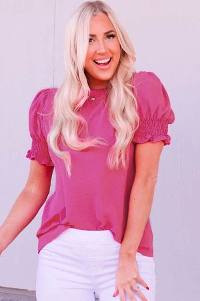 Rose Solid Color Smocked Puff Sleeve Blouse