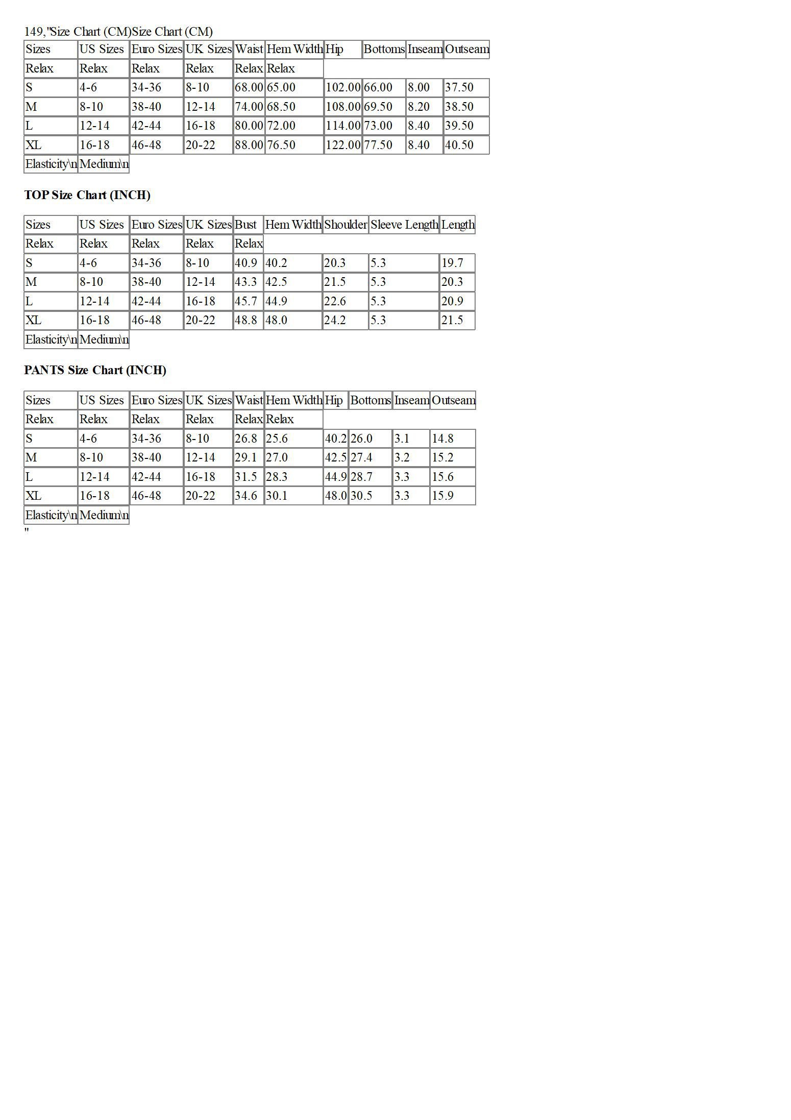 Sizes | US Sizes | Euro Sizes | UK Sizes | Waist | Hem Width | Hip | Bottoms | Inseam | Outseam |