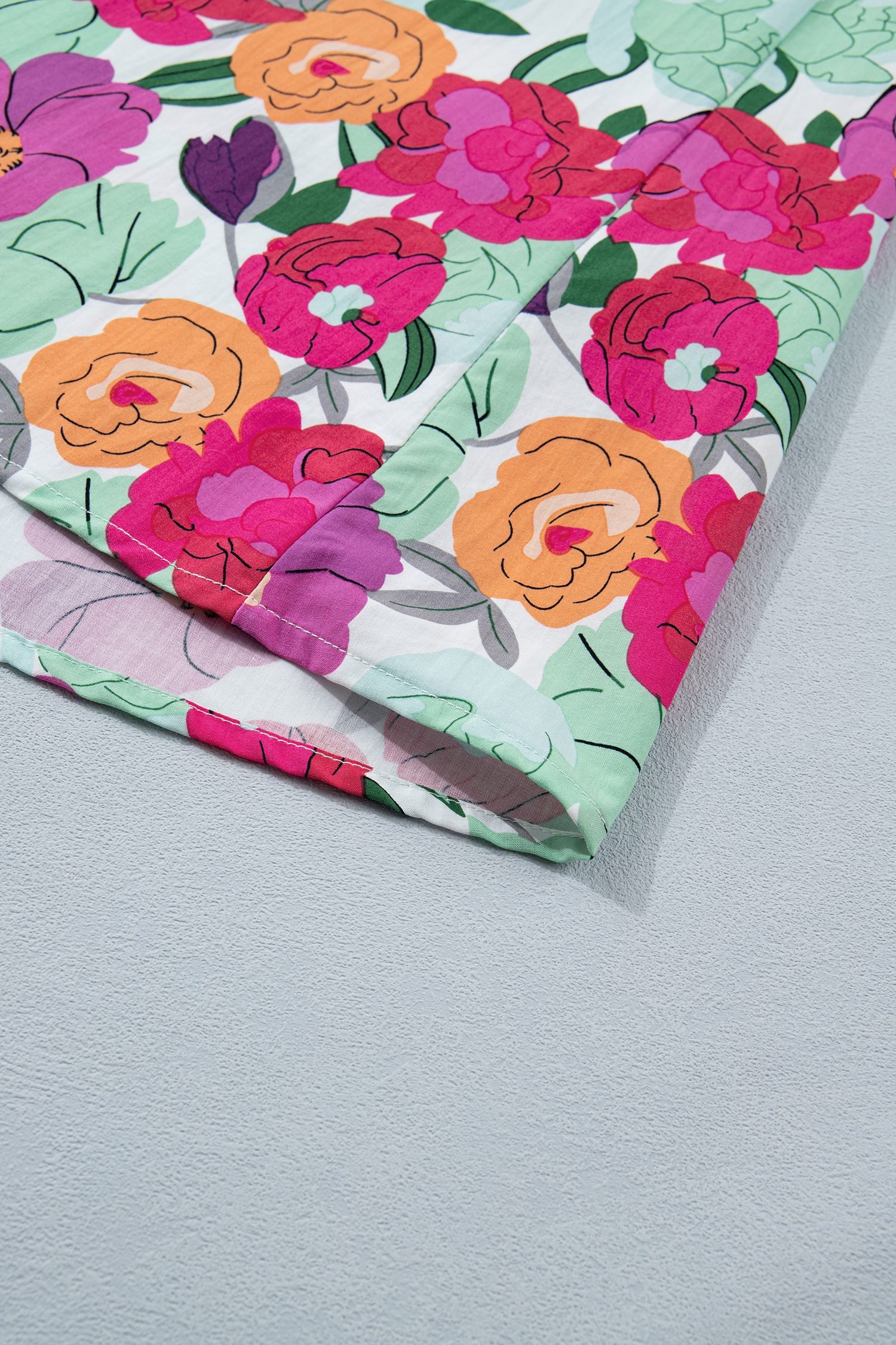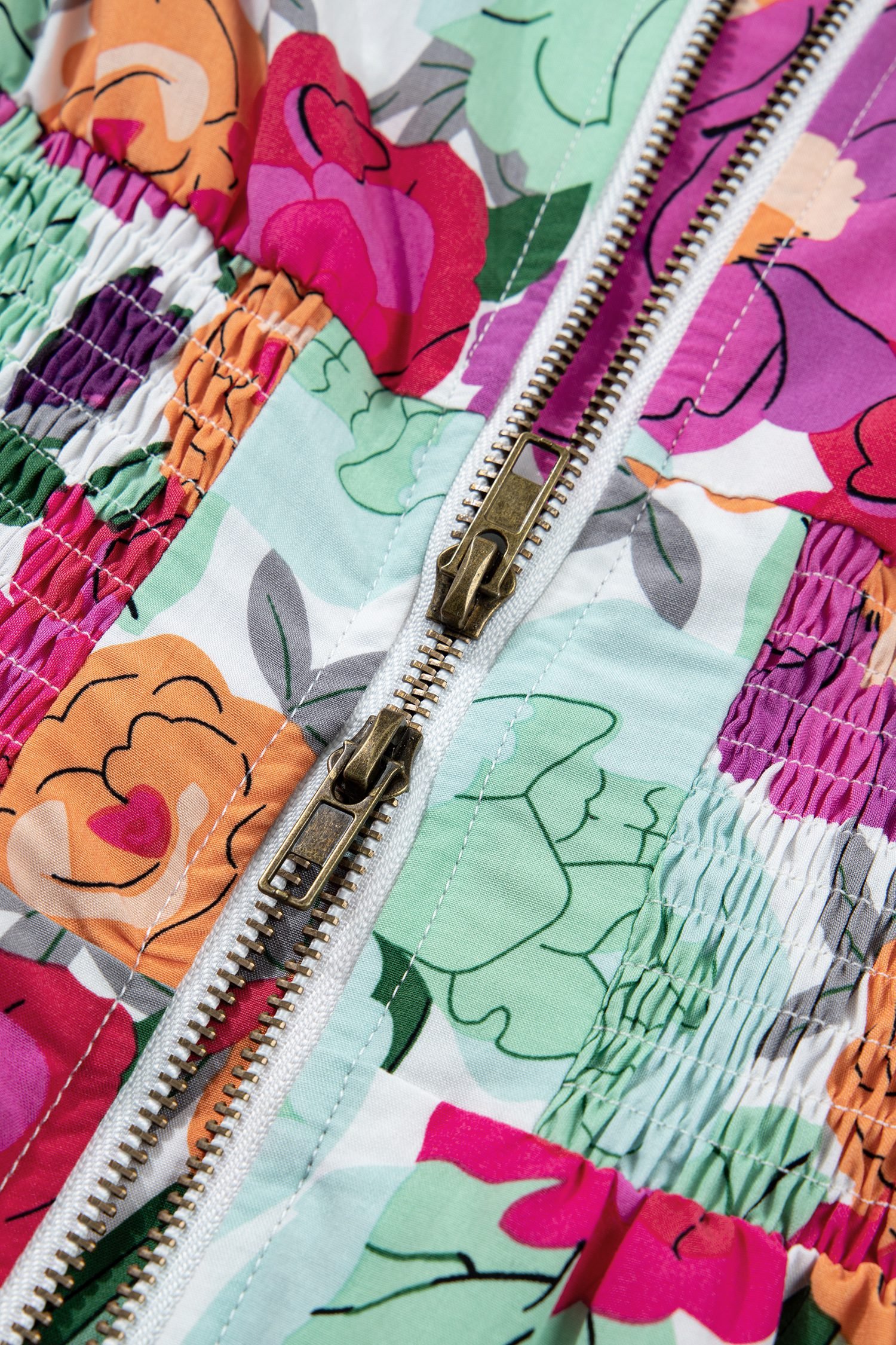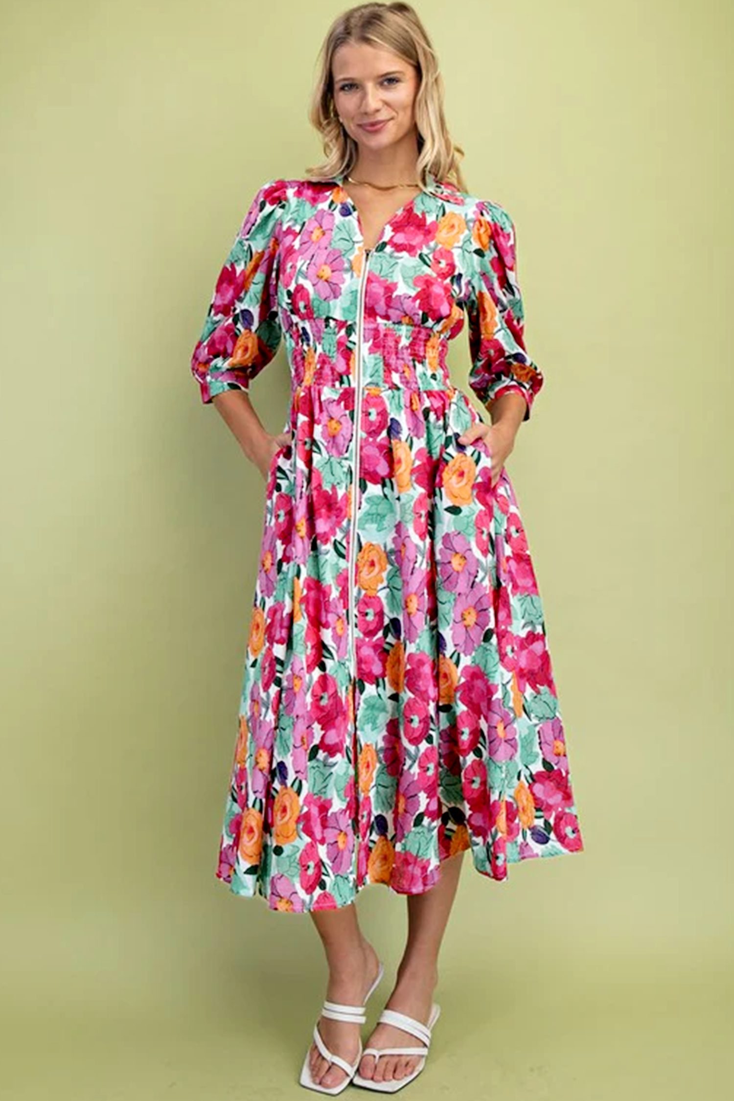 Rose Vibrant Floral Print V Neck Zip Up Puffy Half Sleeve Dress