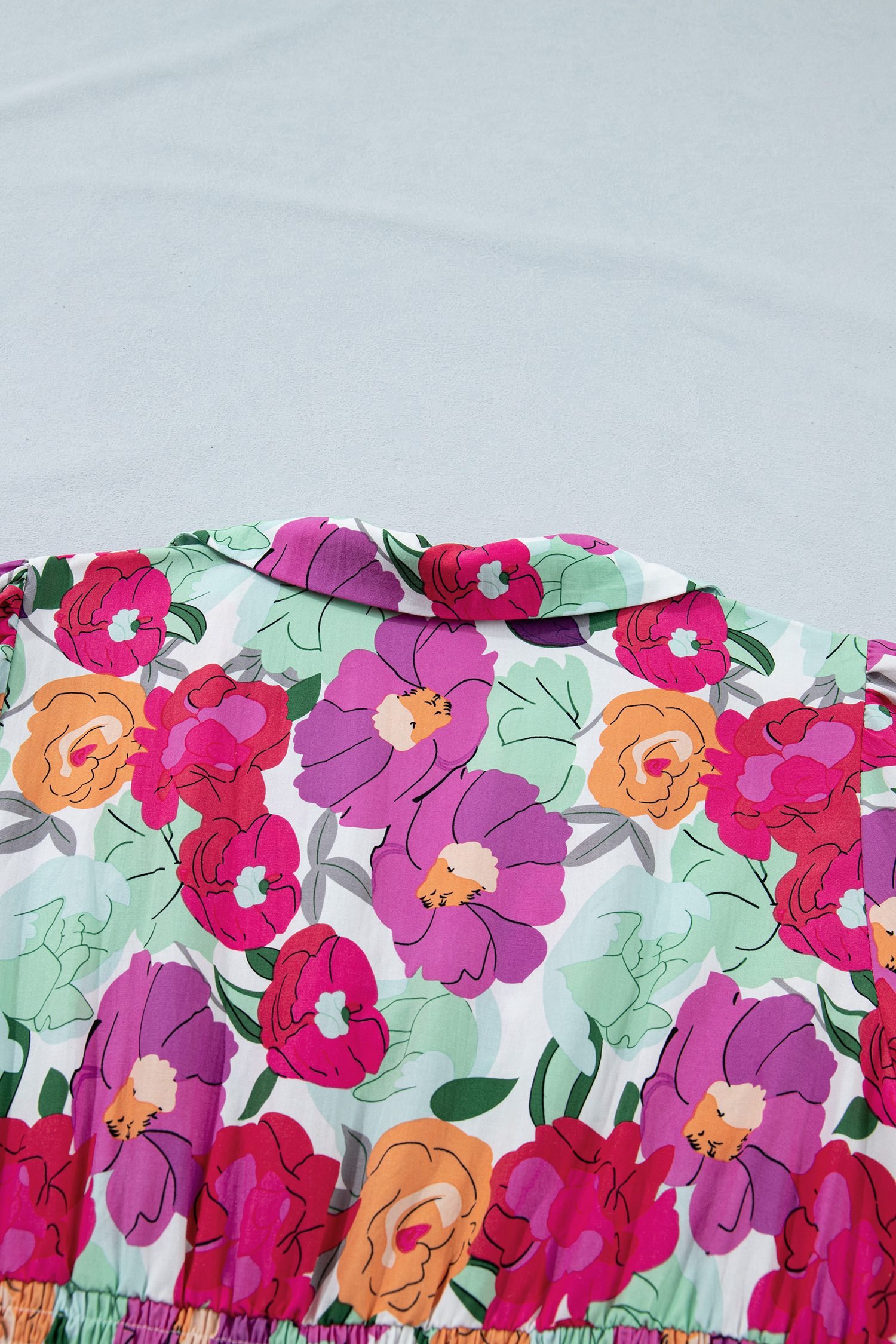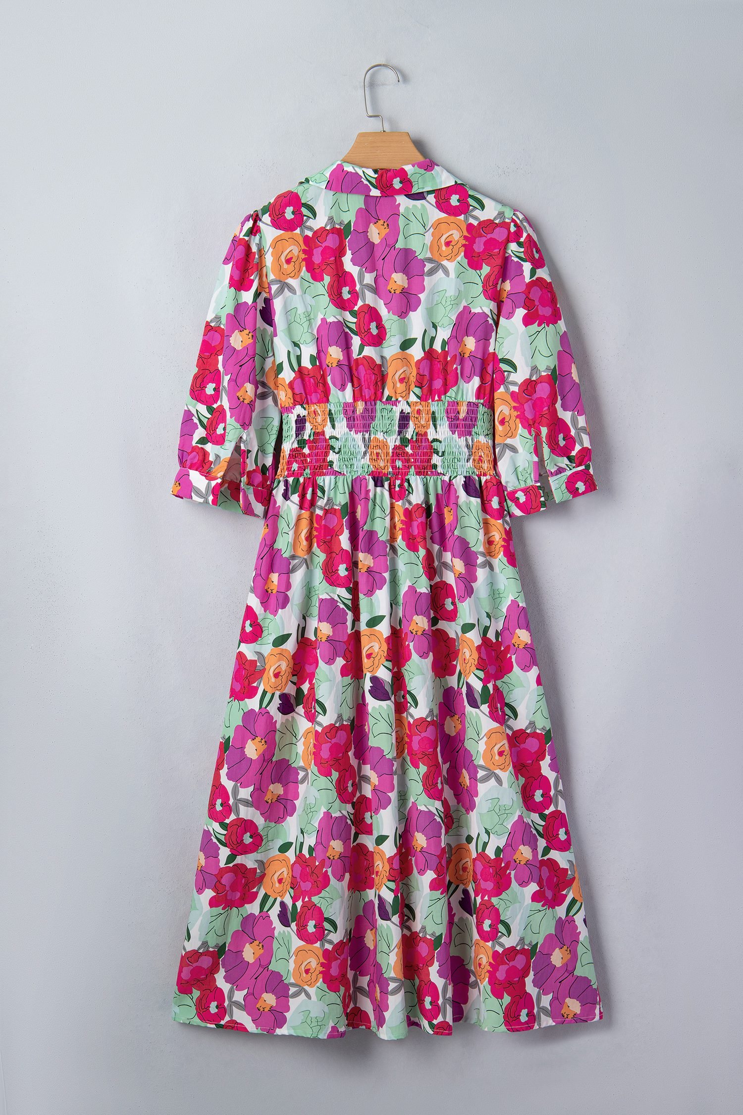 The shirred waistband and flared skirt create a romantic silhouette.