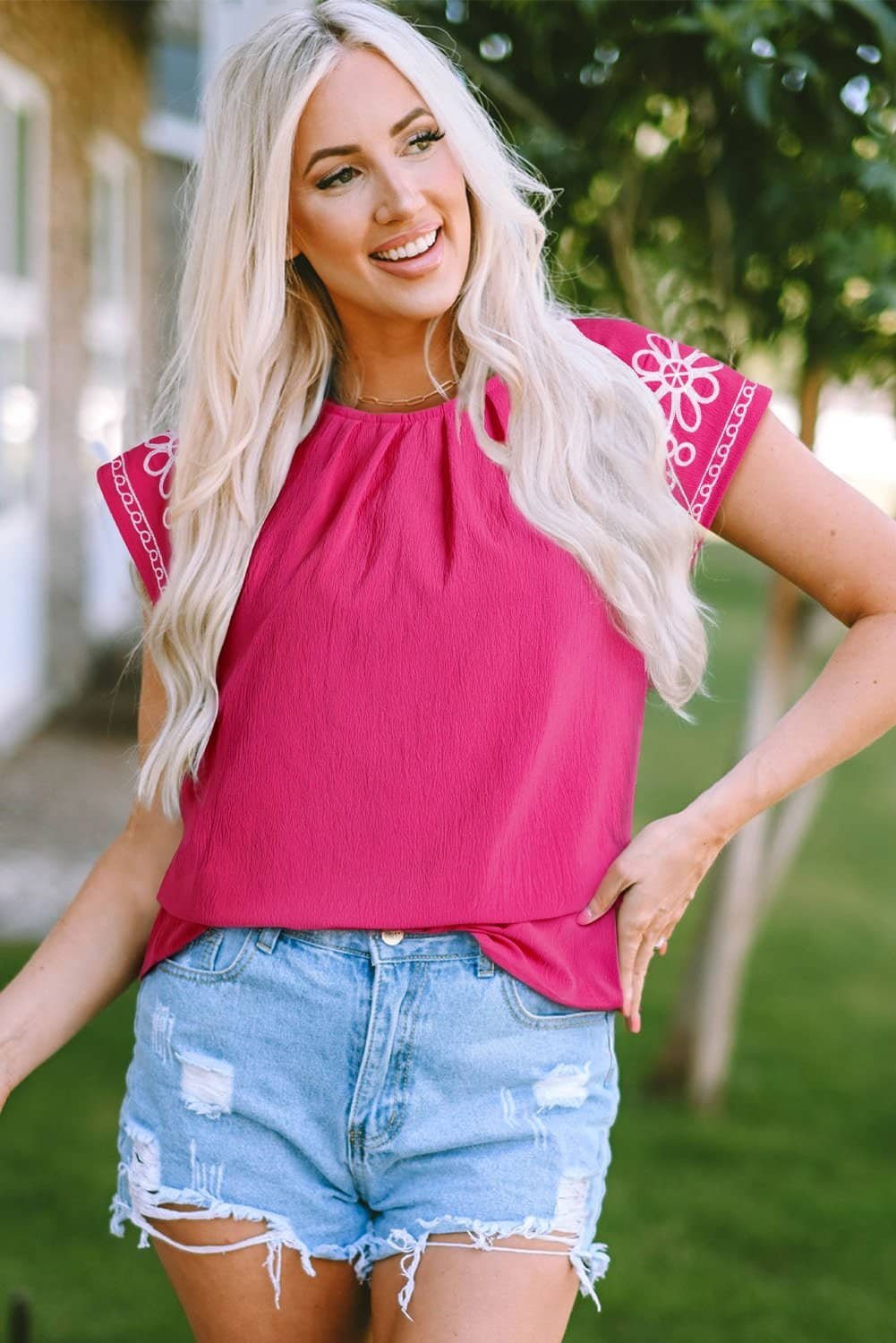 Sachet Pink Floral Embroidered Flutter Sleeve Pleated Neck Blouse