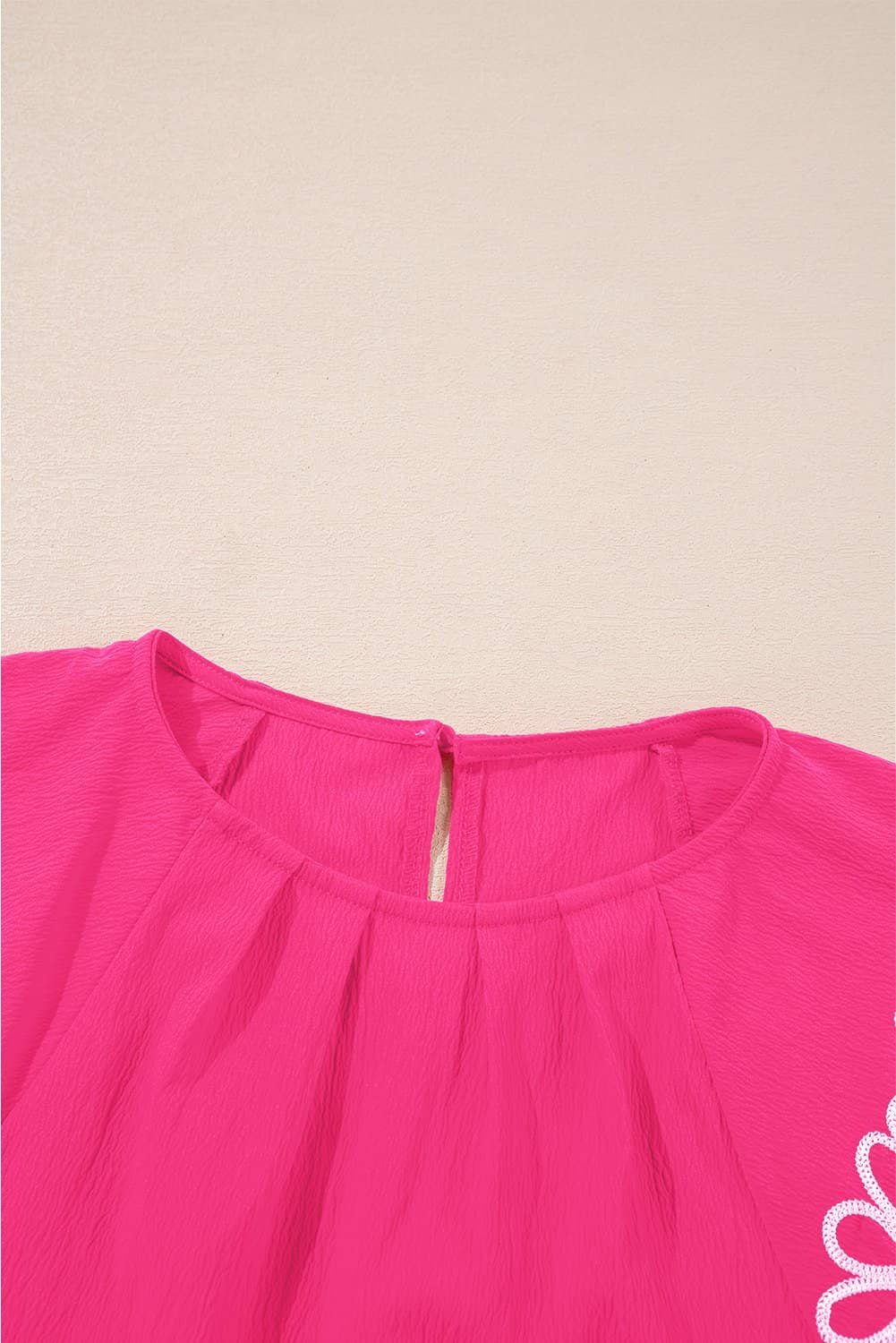 Be the first to review “Sachet Pink Floral Embroidered Flutter Sleeve Pleated Neck Blouse”