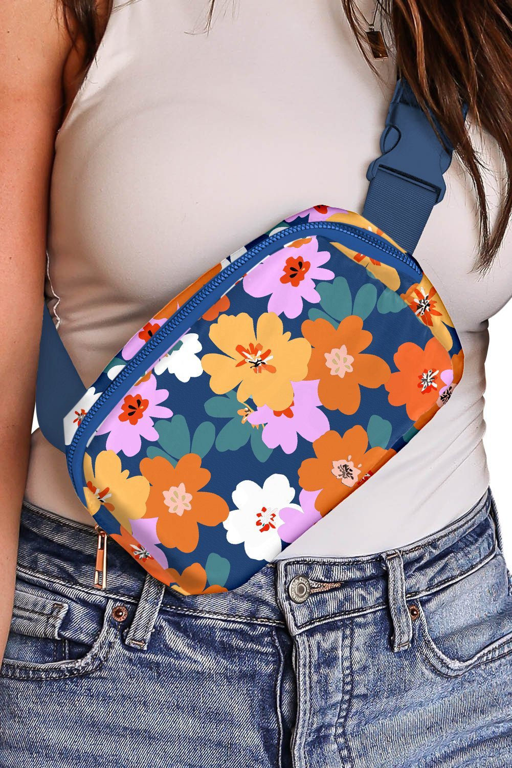 Be the first to review “Sail Blue Flower Print Zipper Buckle Wide Strap Sling Bag”
