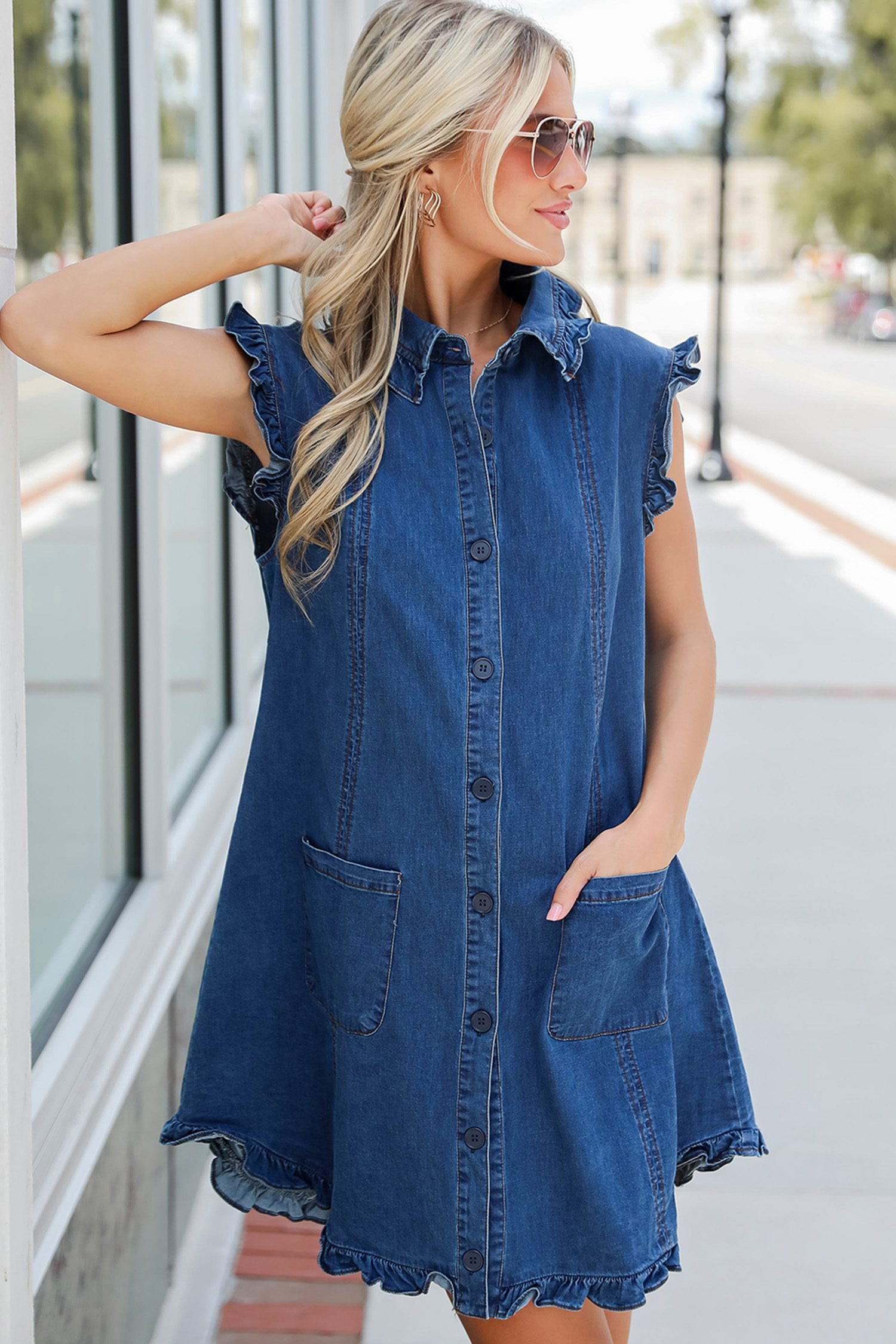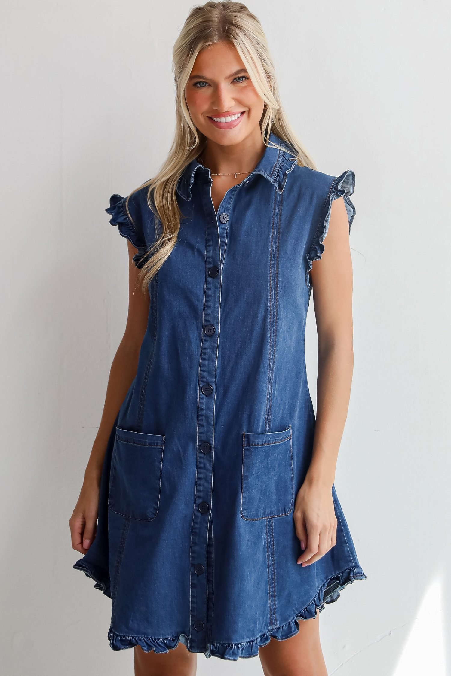 Collared denim dress features ruffled edges for a feminine look.