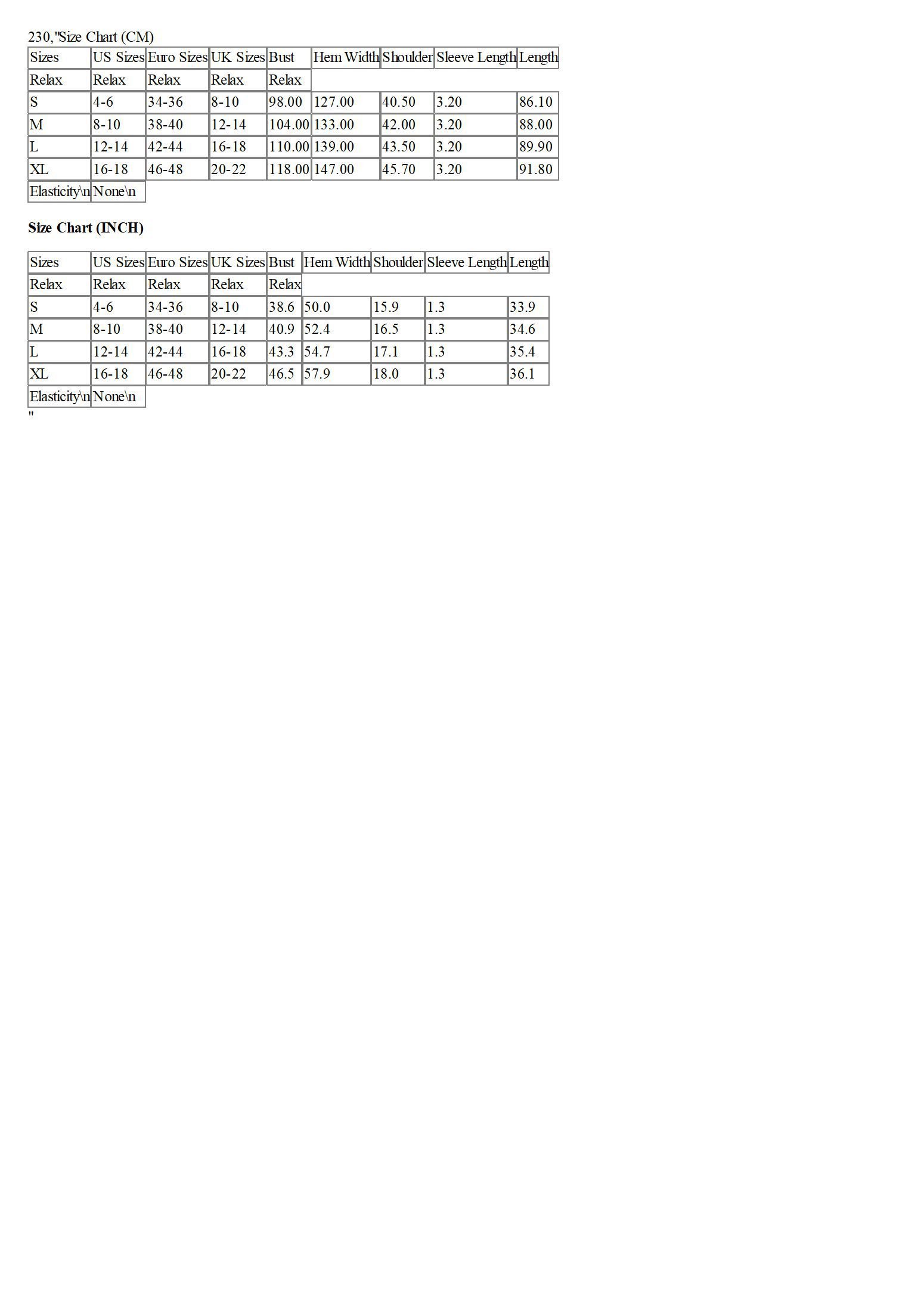 Sizes | US Sizes | Euro Sizes | UK Sizes | Bust | Hem Width | Shoulder | Sleeve Length | Length |