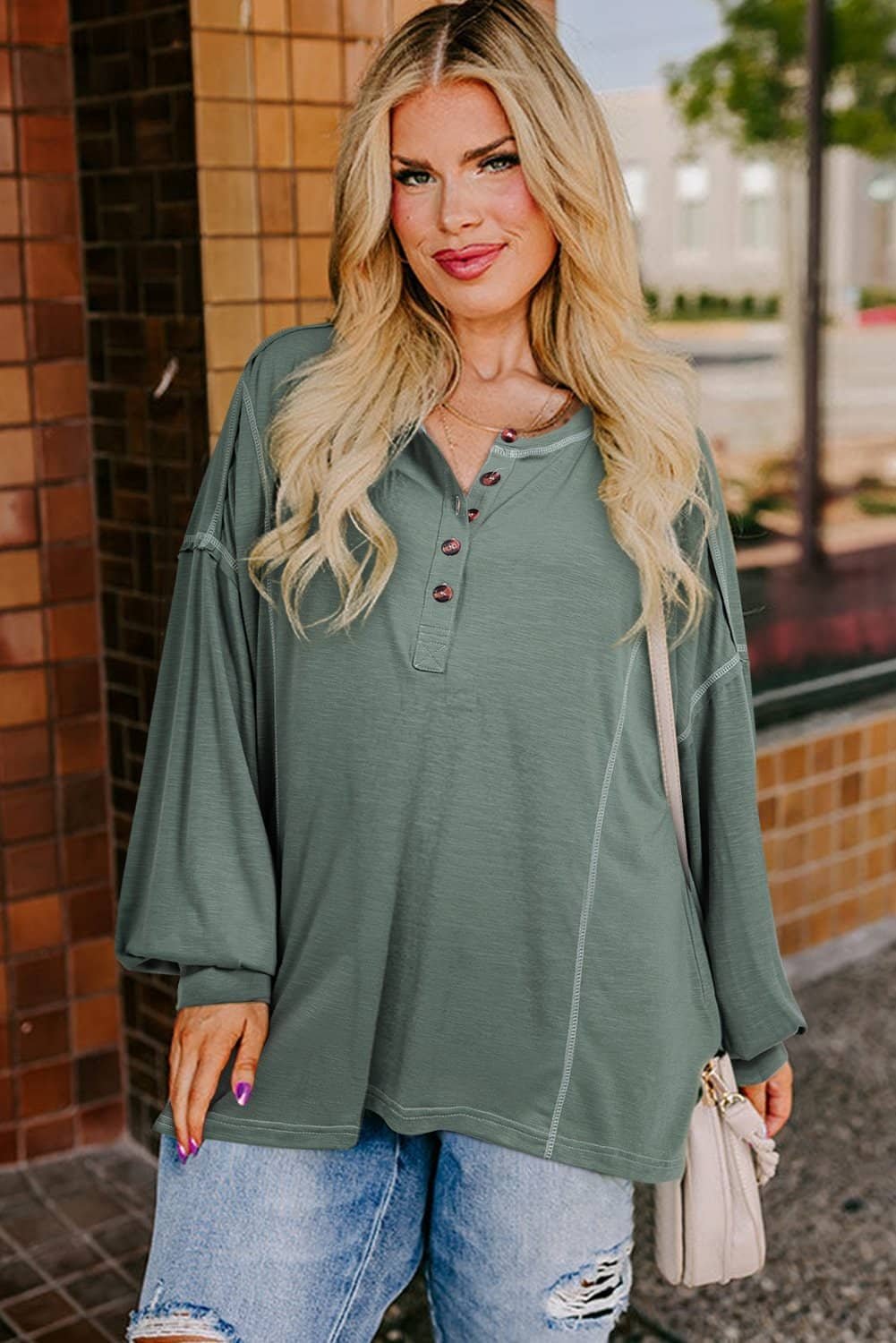 Seagrass Plus Size Exposed Seam Drop Shoulder Henley Top