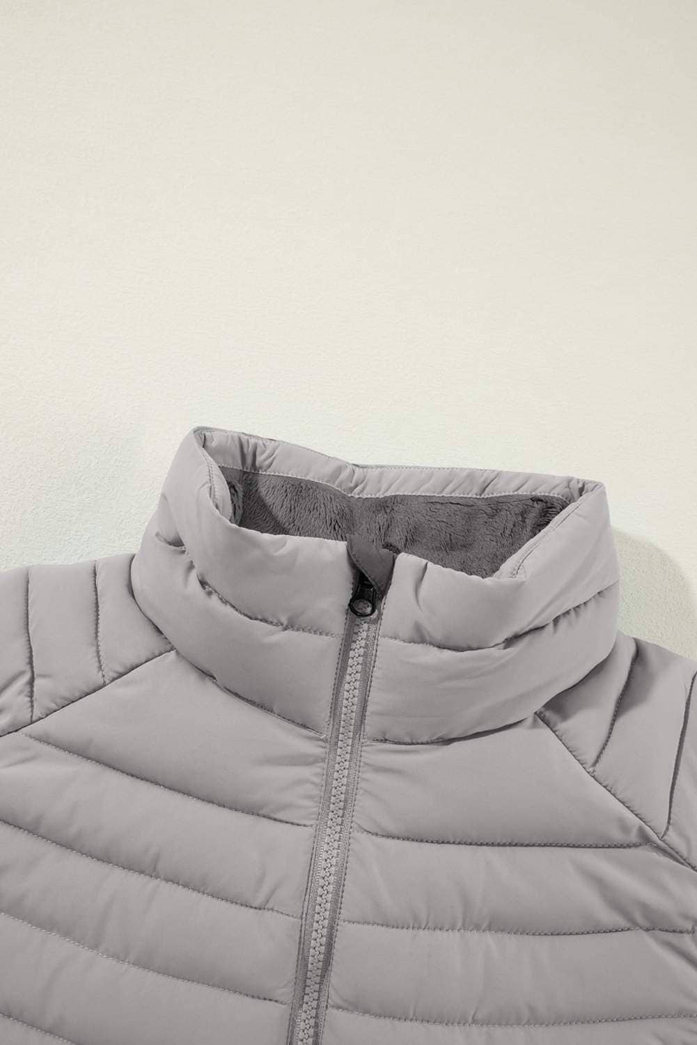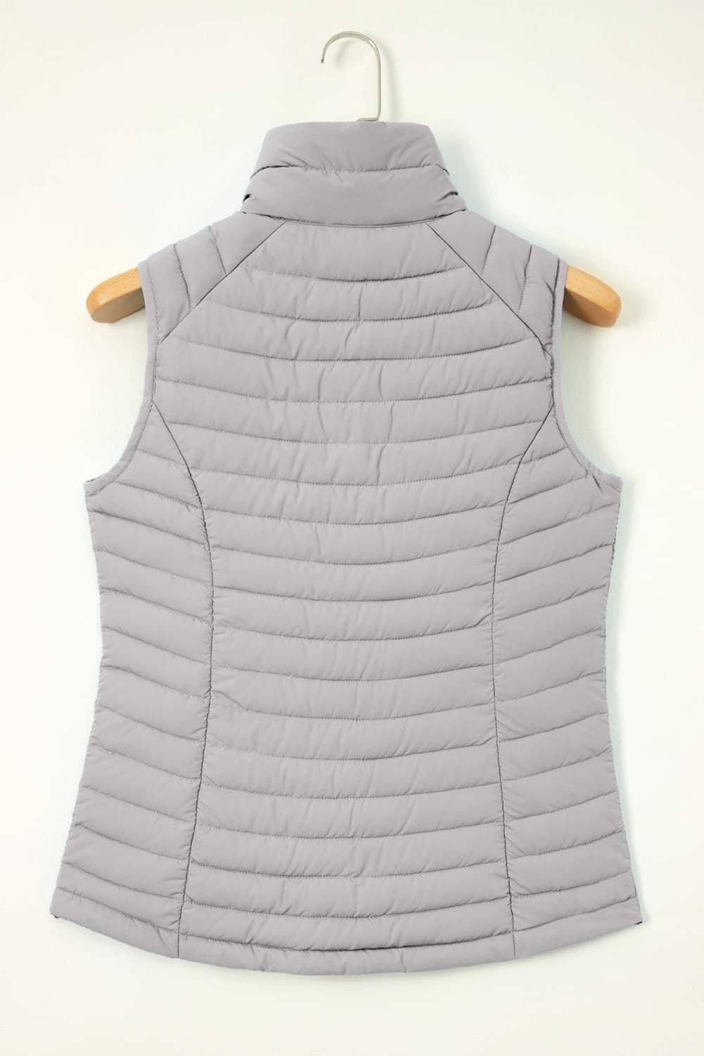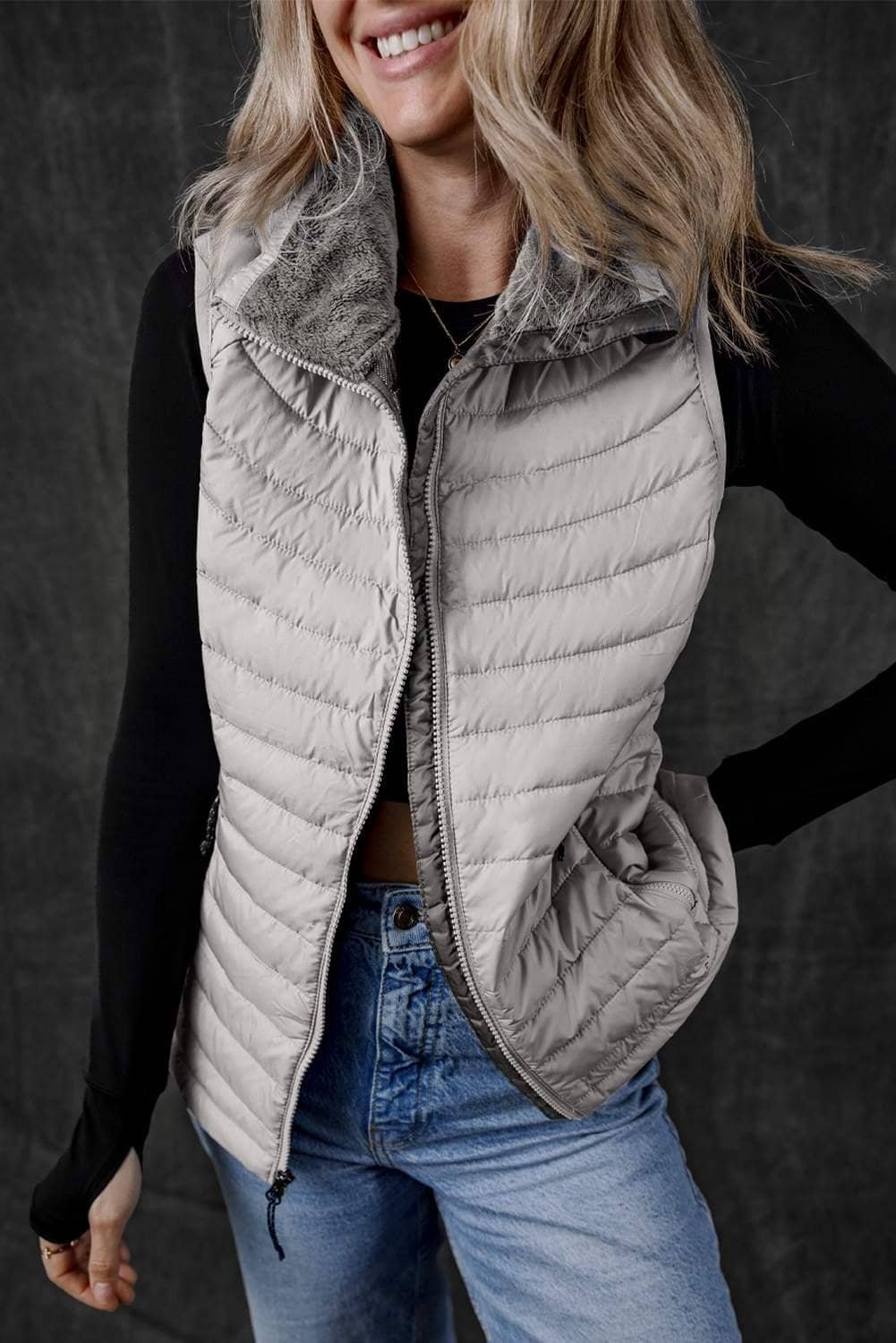 Silvery Plush Collared Quilted Zipped Puffer Vest