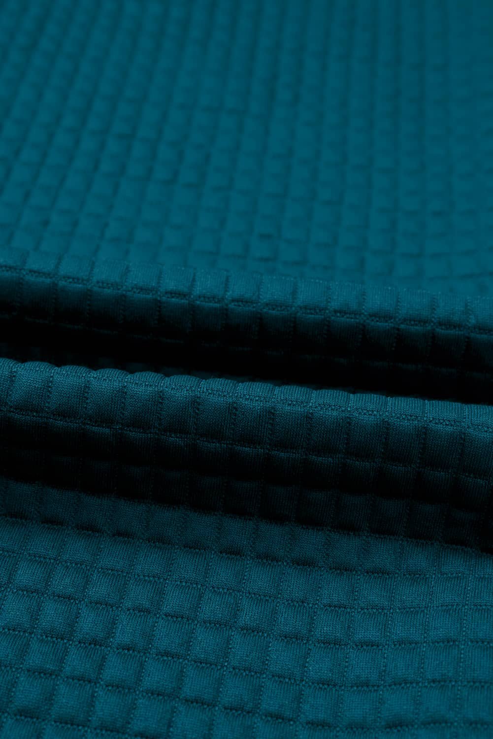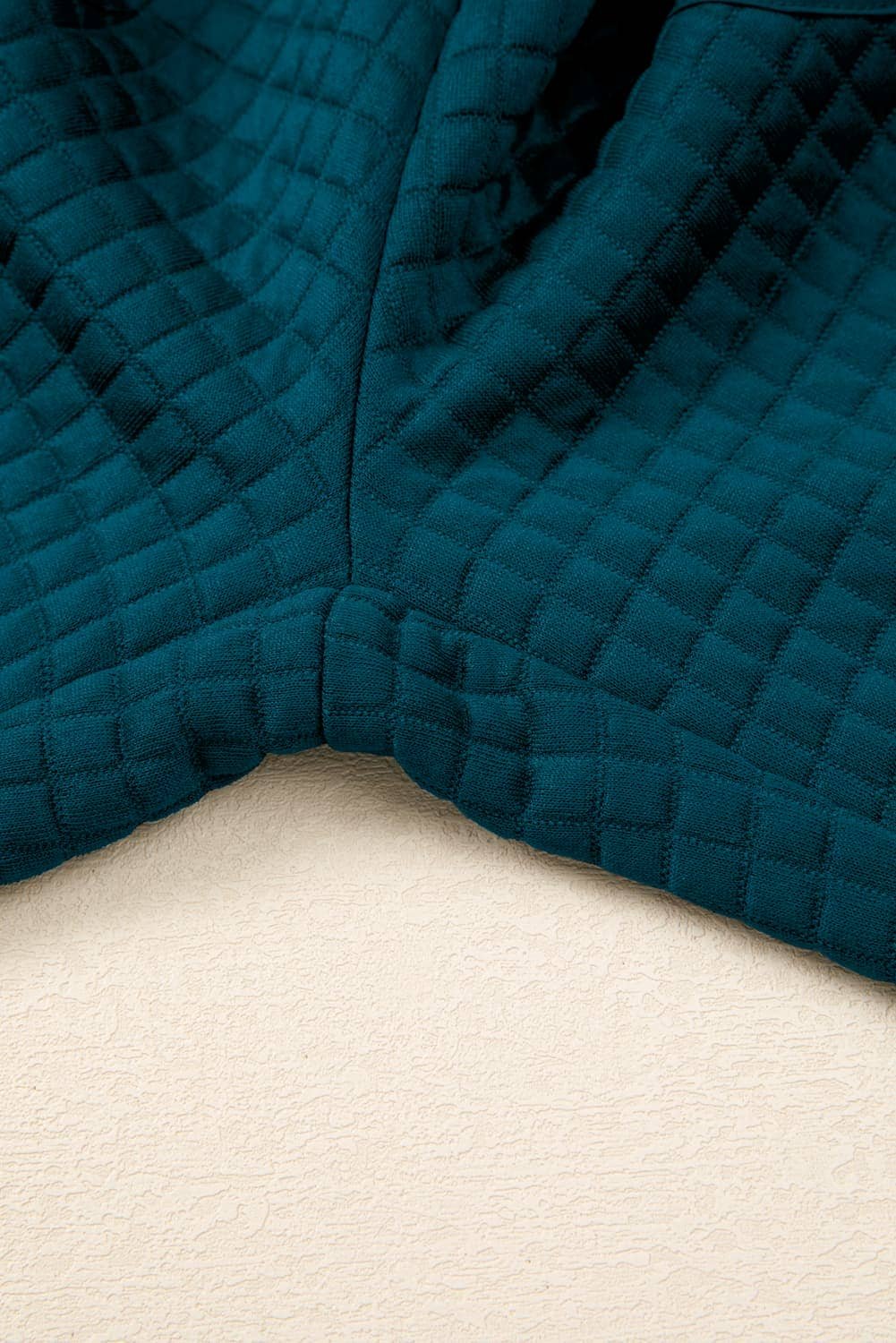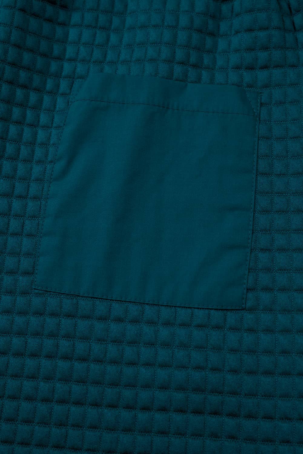 Features a raw seam design with waffled patchwork.