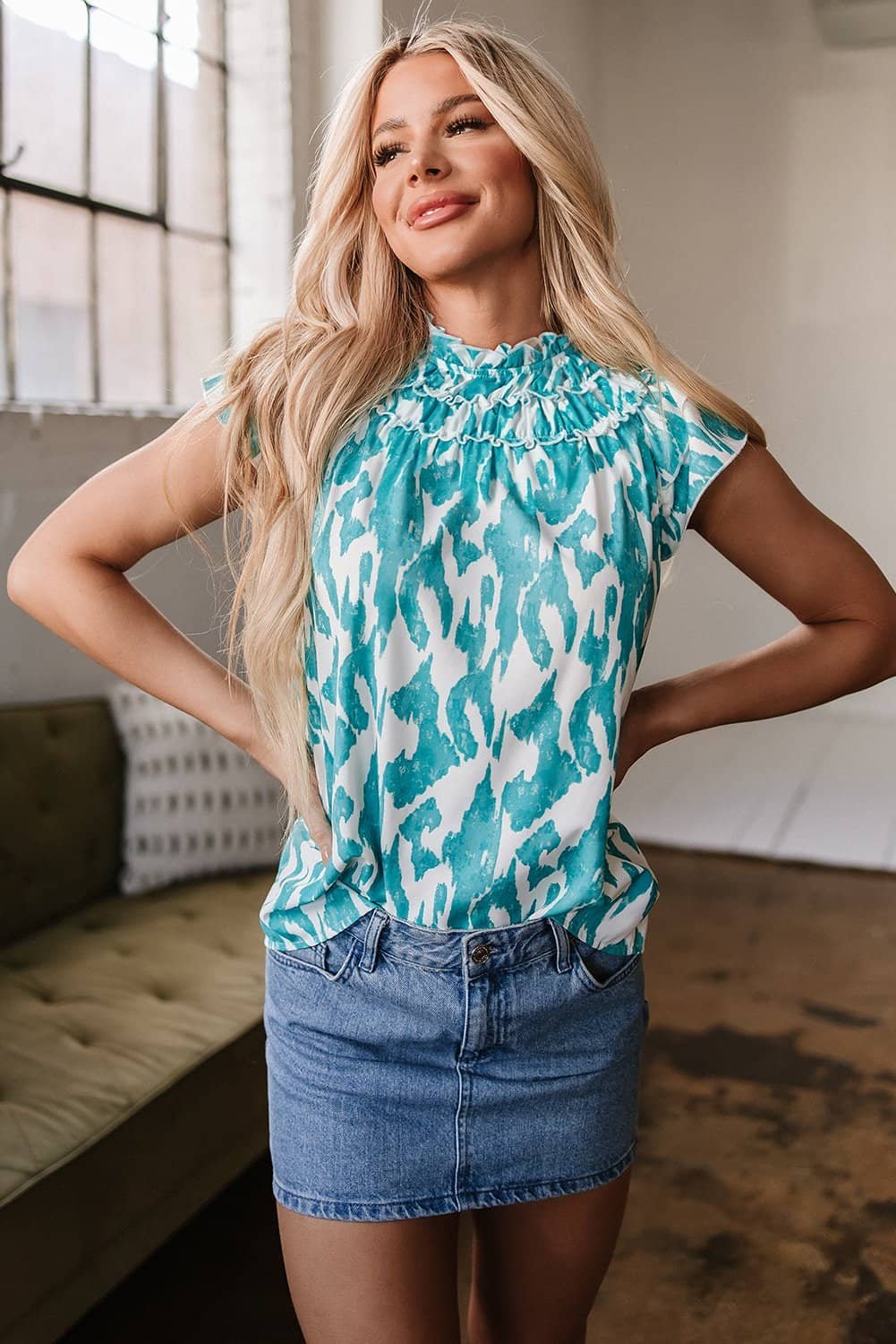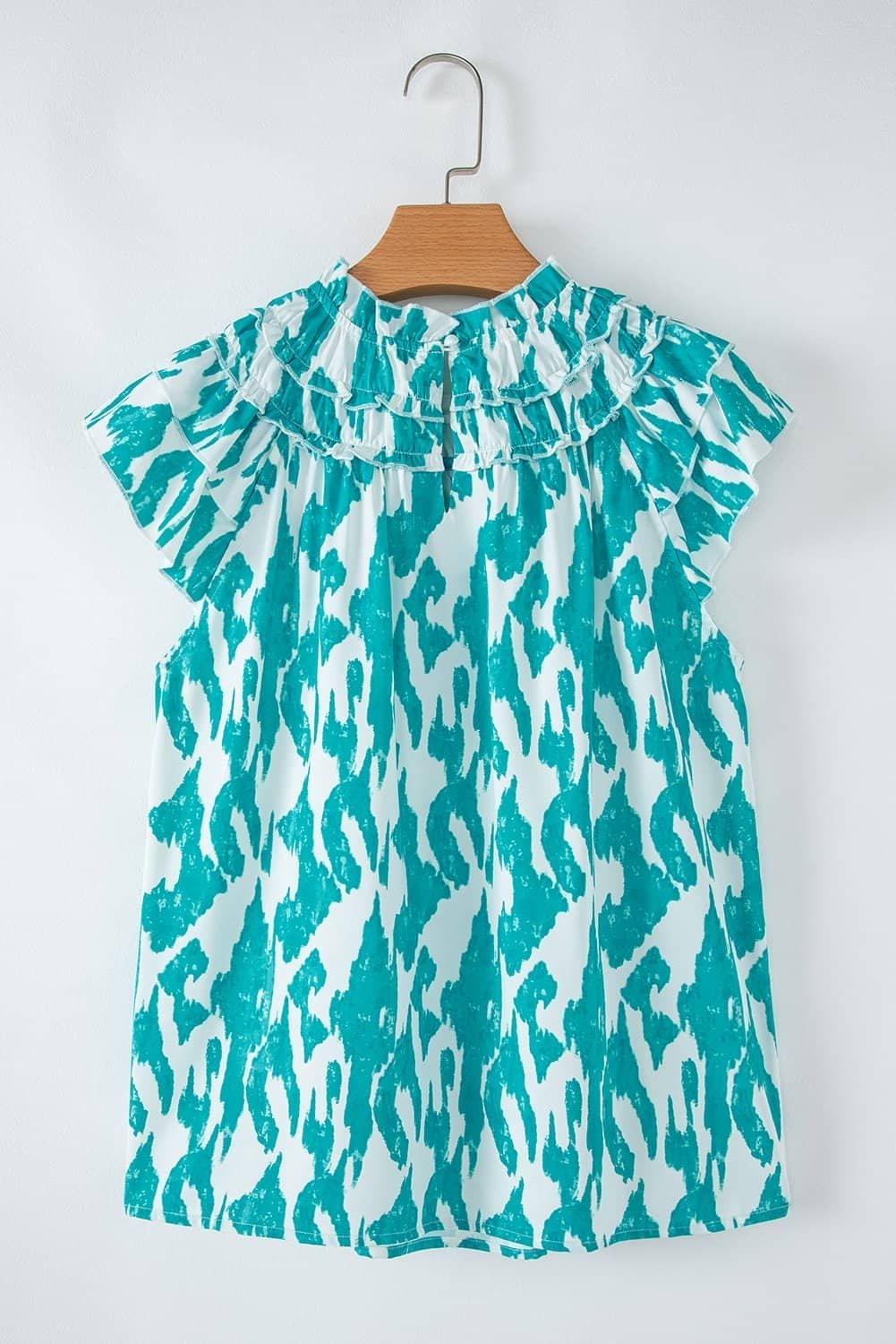 The frilled crewneck and ruffled short sleeve make this top more elegant and feminine.