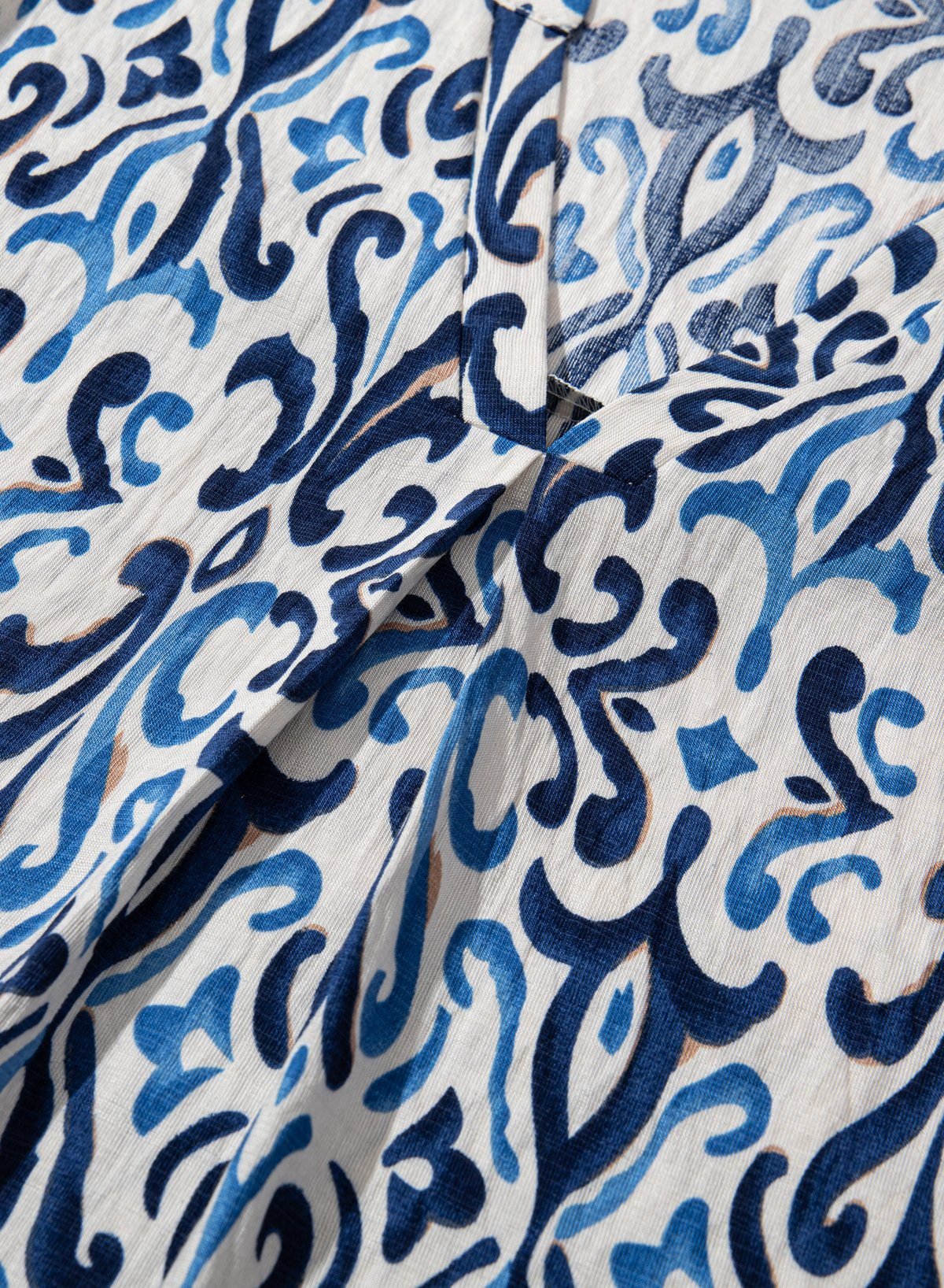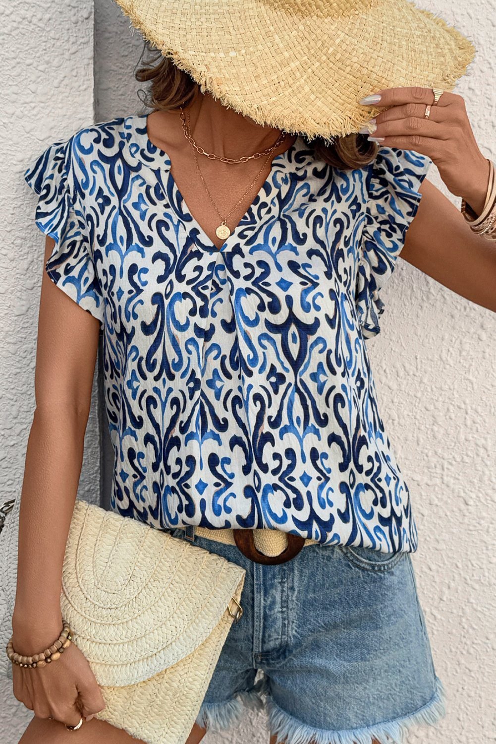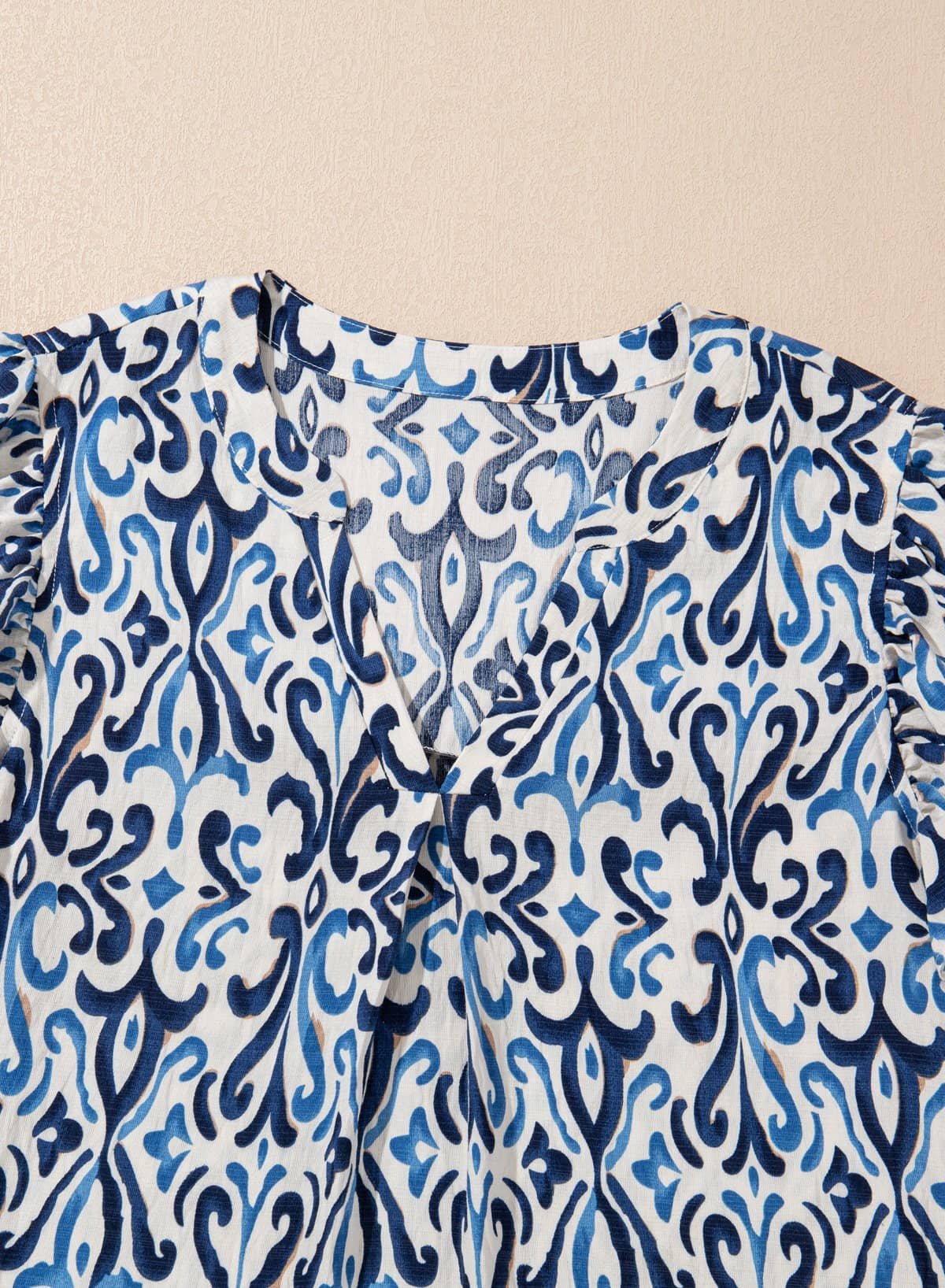 Sky Blue Boho Abstract Print Pintuck Detail Ruffled Top