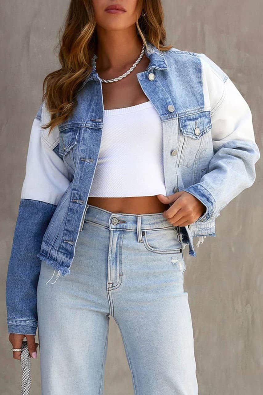 Sky Blue Color Block Denim Patchwork Frayed Hem Jacket