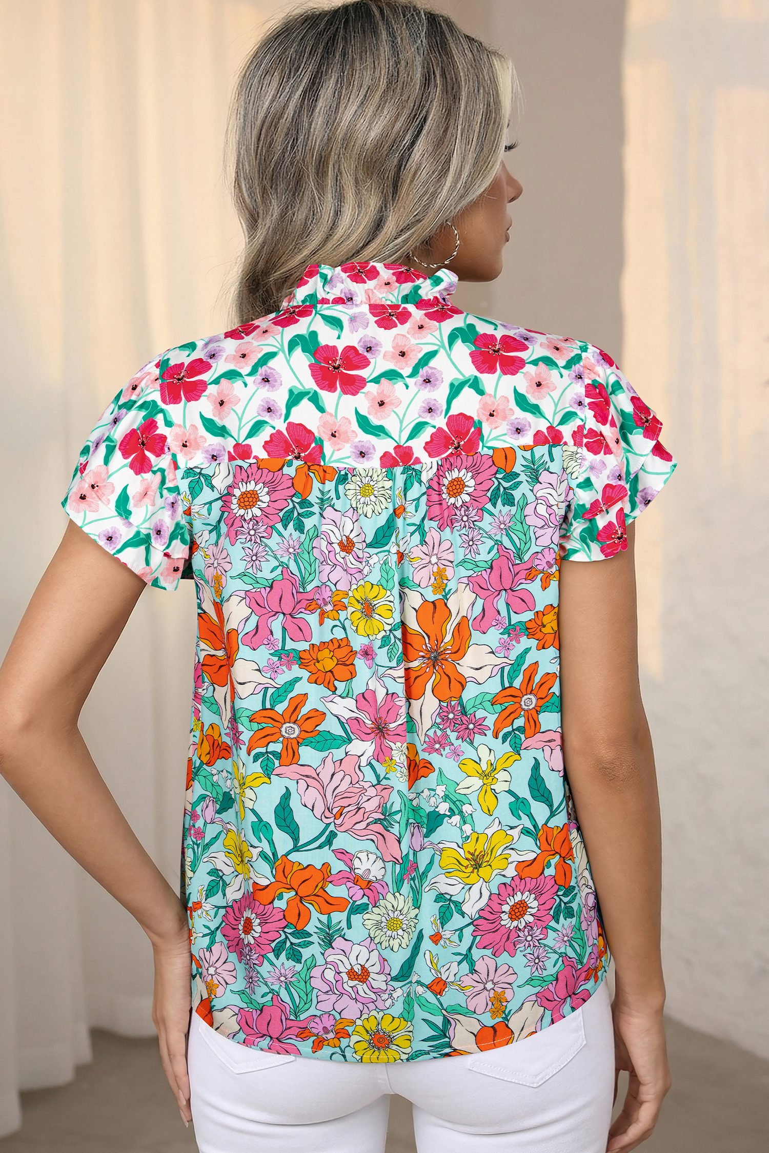 This summer blouse is stylish and feminine with blooming floral pattern.