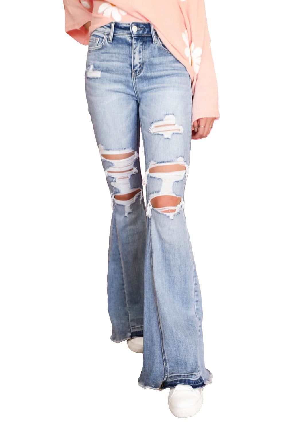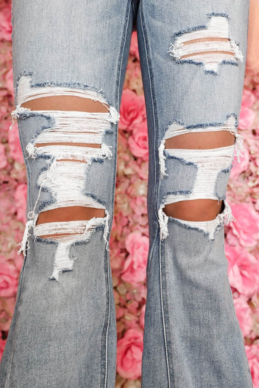 - The distressed detailing adds edge to the classic light wash denim