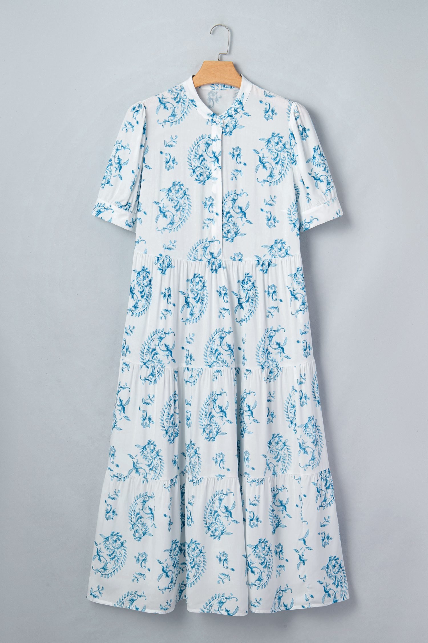 Plus size dress for women with puff sleeves and a tiered skirt.