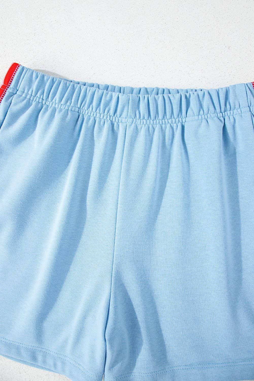 Shorts in the set complement the top, creating a coordinated look.