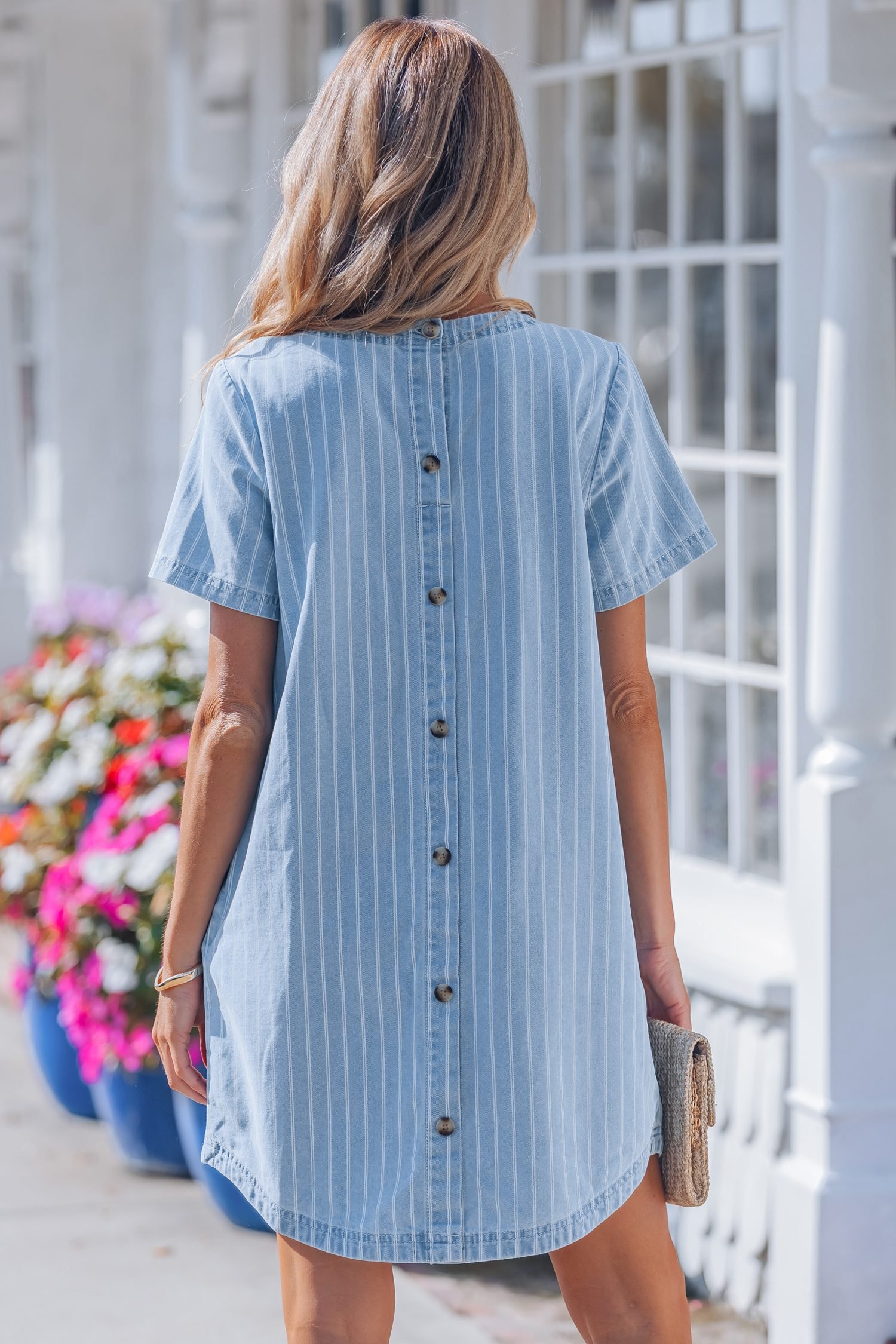 Shift fit style with buttoned back for stylish detail.