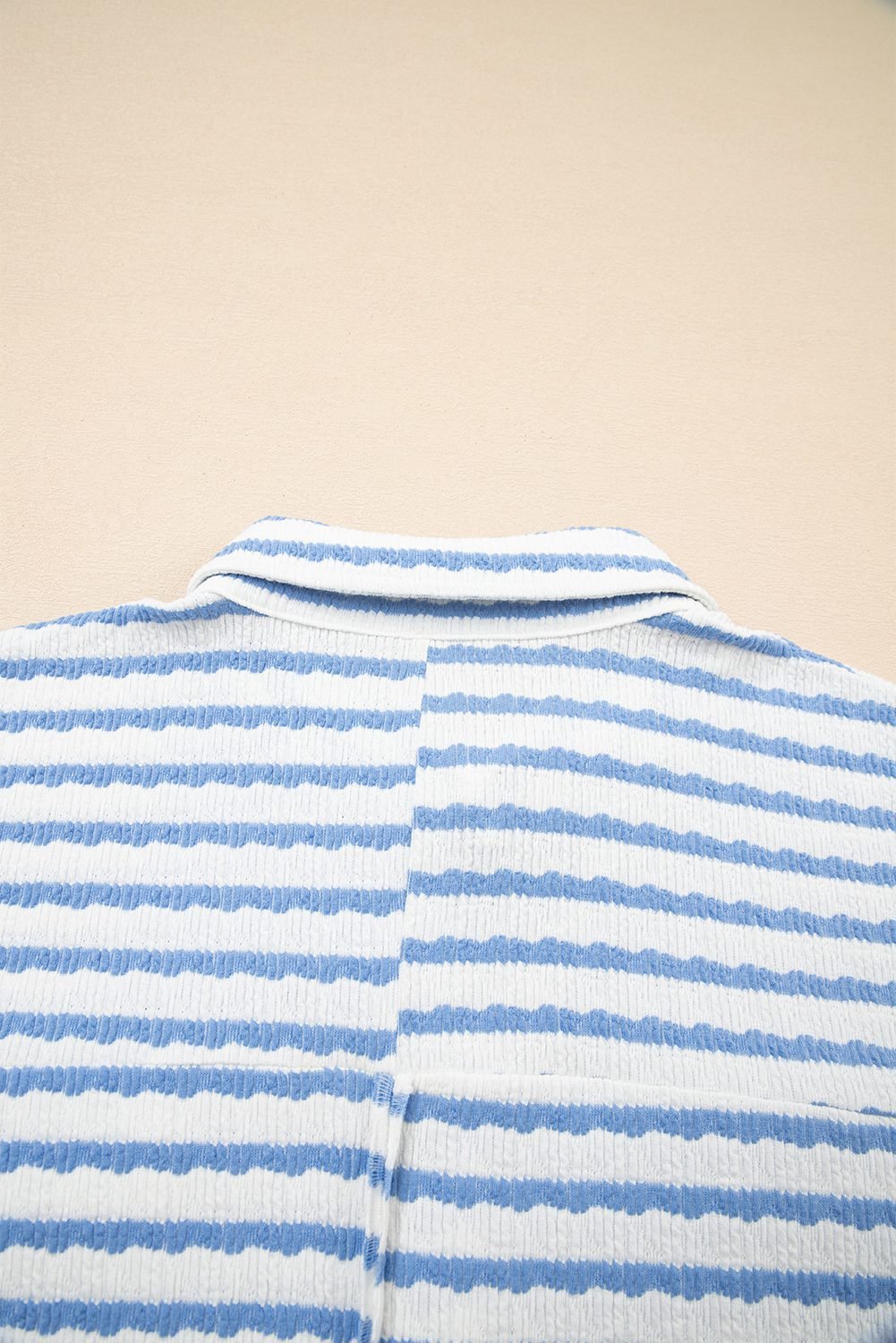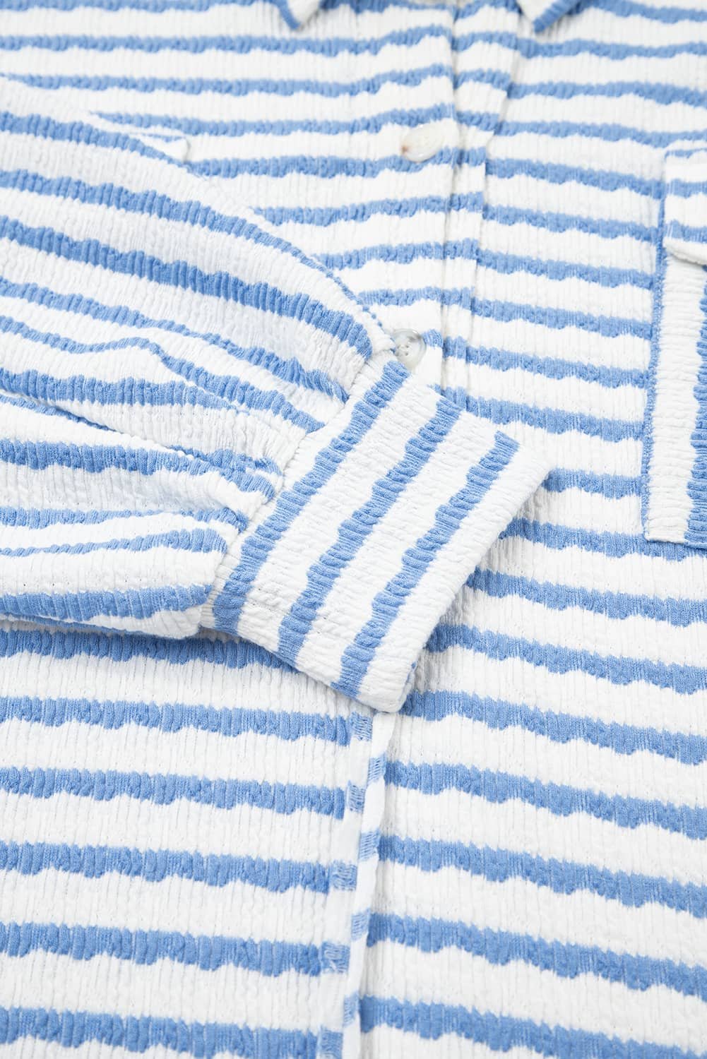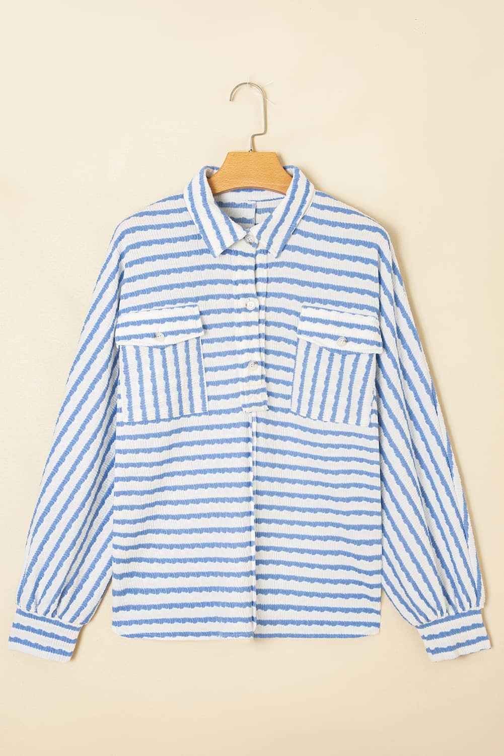 Sky Blue Stripe Half Button Collared Chest Pockets Loose Fit Blouse