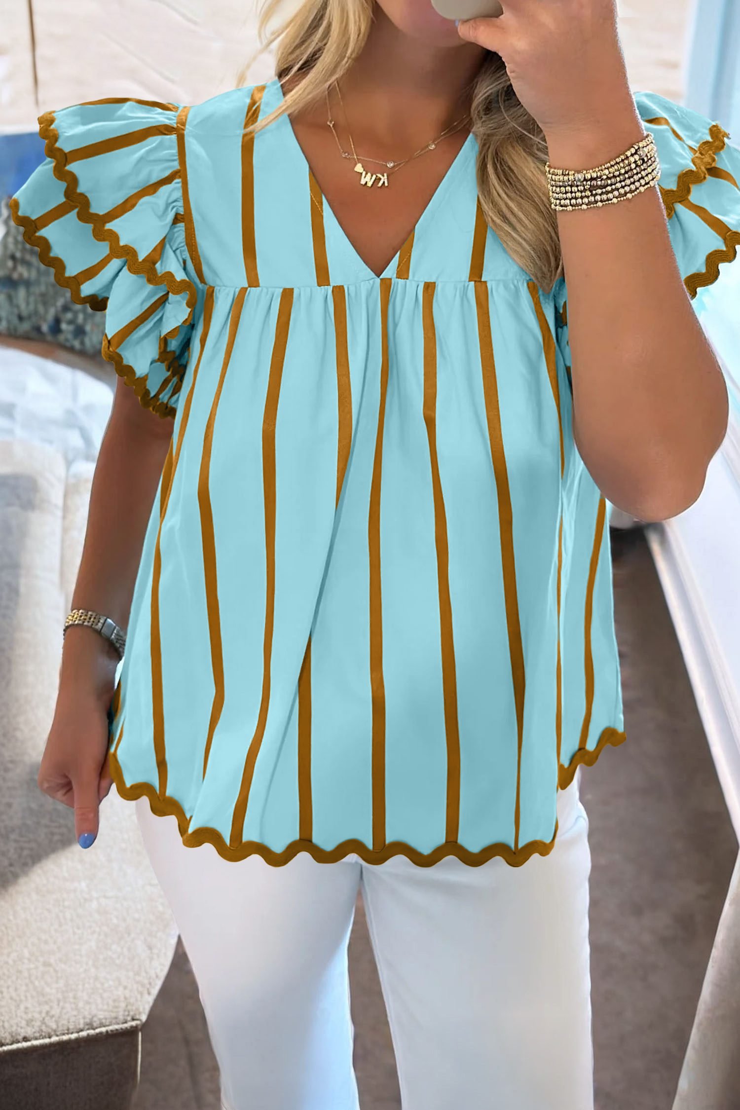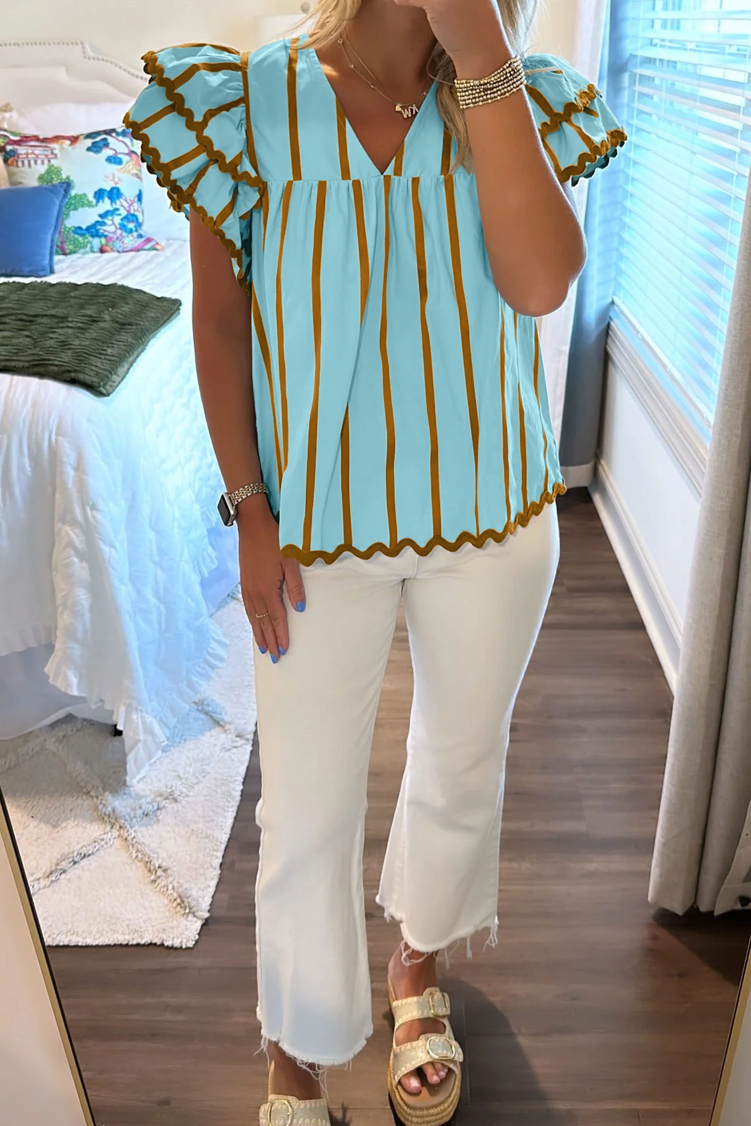Sky Blue Stripe Ricrac Trim Double Ruffled Short Sleeve V Neck Blouse