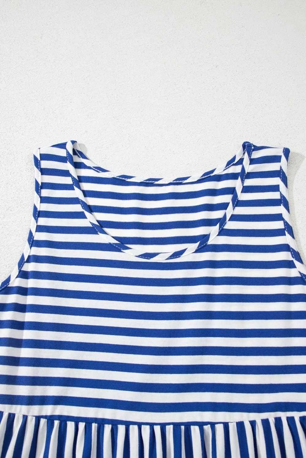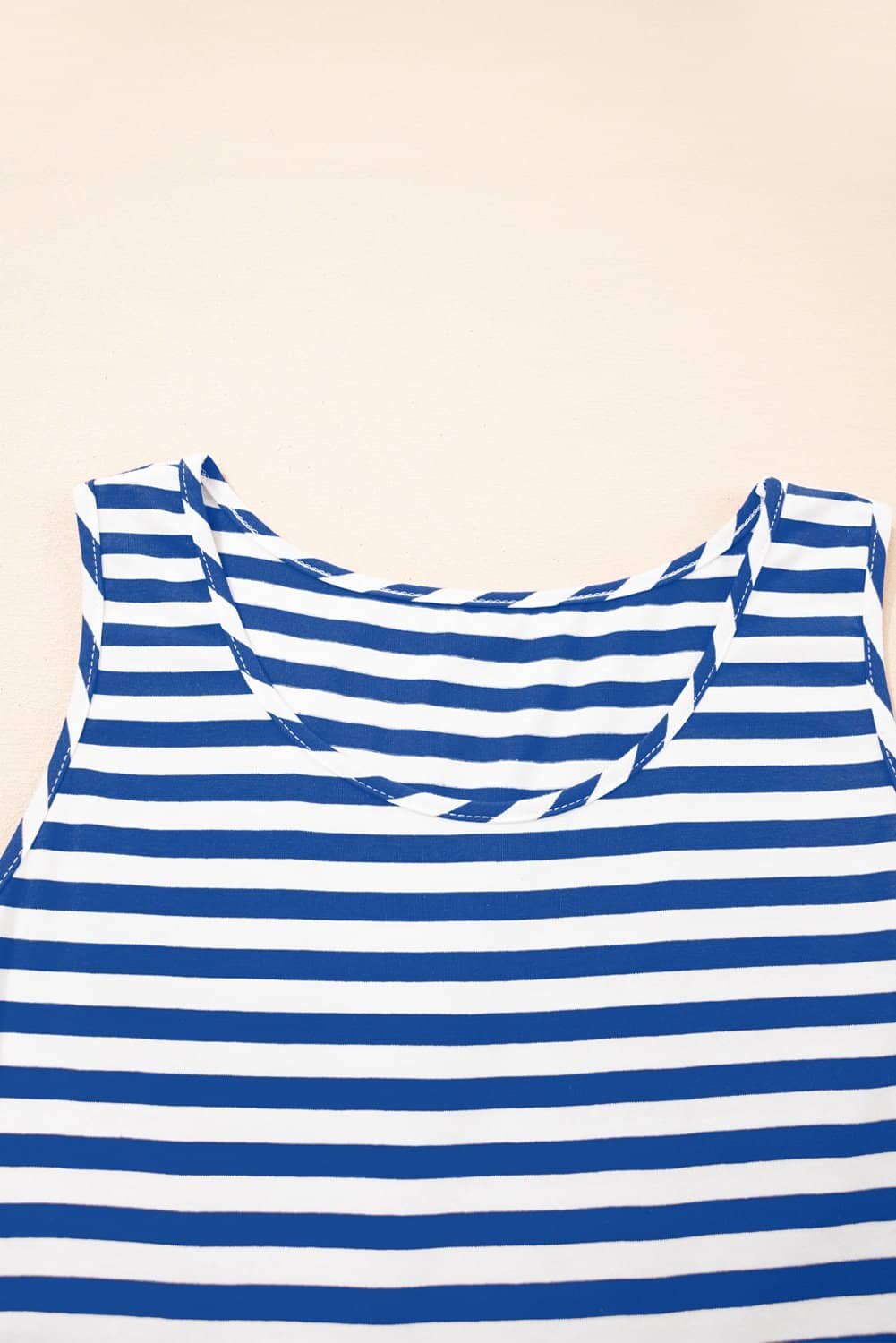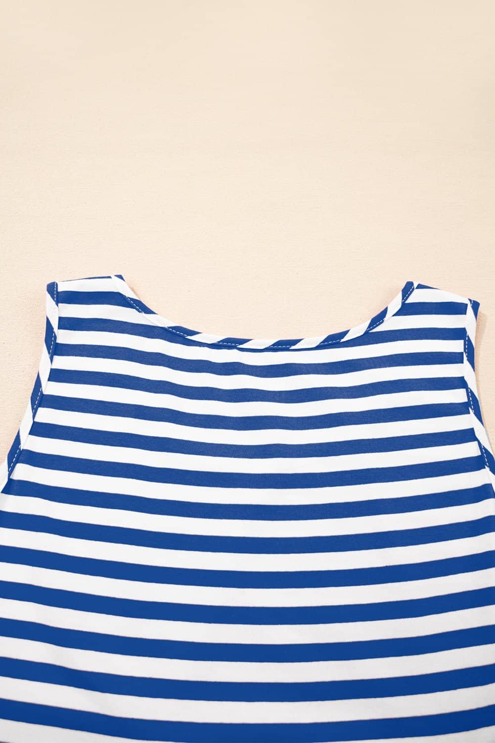 - This striped dress features chic U-necklines and sleeveless designs for a modern look.