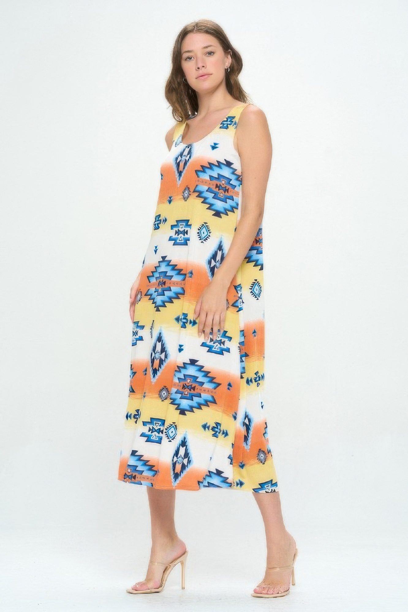 A staple you™ll reach for again and again, this long dress is sleeveless with a soft, rounded neckline for relaxed sophistication. Designed with comfort in mind, it features a flowy fit and vibrant prints that feel fresh every season. The stretch fabric moves with your body, keeping you comfortable wherever your day takes you. Whether styled simply or accessorized, this piece is endlessly versatile. Made in the USA for superior quality.
