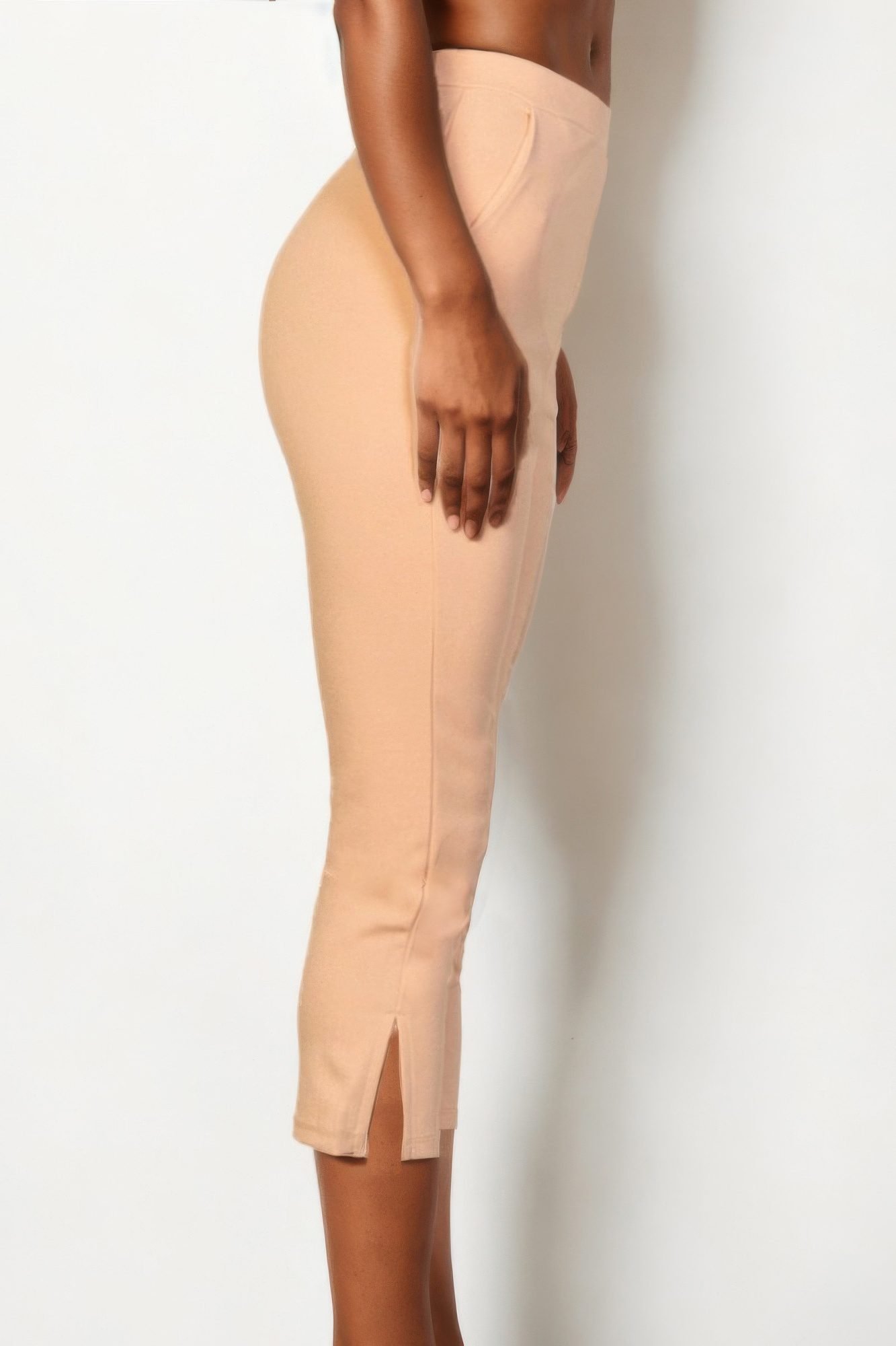 Step into effortless style and comfort with these slit-hem cropped pants. Designed with a modern silhouette, these pants feature a versatile elasticized waist for a snug yet flexible fit, making them perfect for all-day wear. The chic slit hem detail adds a contemporary twist to these classic cropped pants, making them suitable for both casual and semi-formal occasions.Crafted from a soft, lightweight stretch crepe fabric, these pants combine a tailored look with exceptional comfort and ease of movement. Their minimalist design allows for endless styling possibilities, whether you’re dressing them up with heels or keeping it casual with sneakers or flats.Fabric Composition: 96% Polyester, 4% Spandex providing a subtle stretch for a sleek, flattering fit.Measurements (Size Small):Waist: 12″ (unstretched)Inseam: 21″Outseam: 32.5″Fit: The model, standing at 5’9″, wears a size Small, demonstrating a relaxed yet tailored fit.These cropped pants are a must-have addition to your wardrobe. Pair them with a tucked-in blouse for a polished look, or a relaxed tee for a more laid-back vibe. Whether you’re heading to the office, brunch, or a weekend getaway, these pants are the perfect mix of comfort and style.