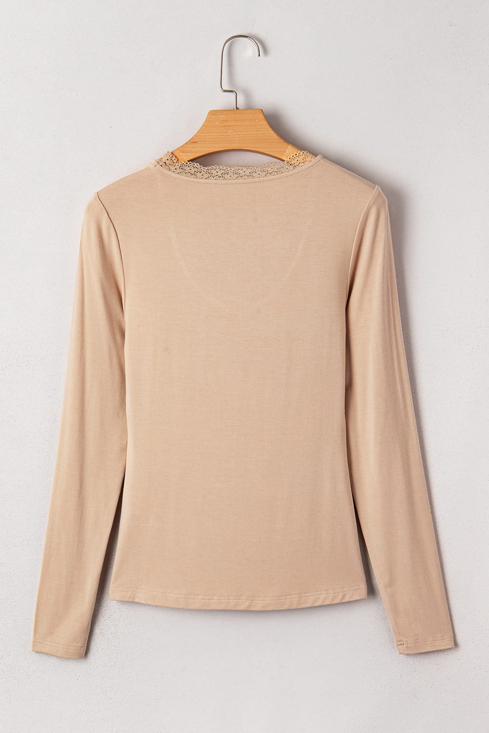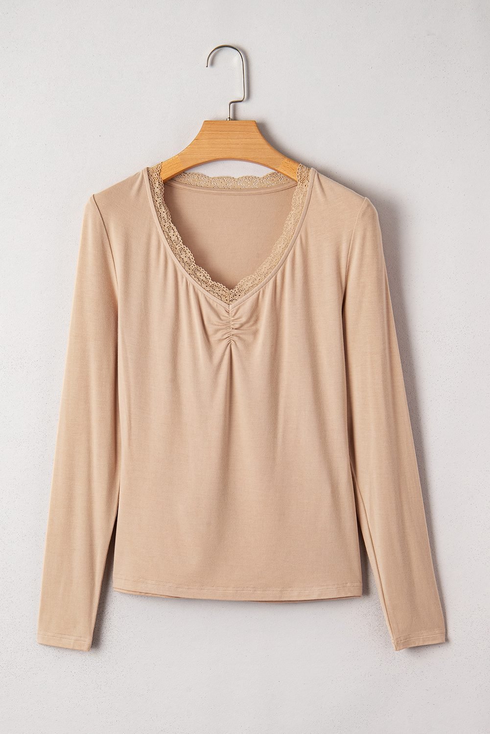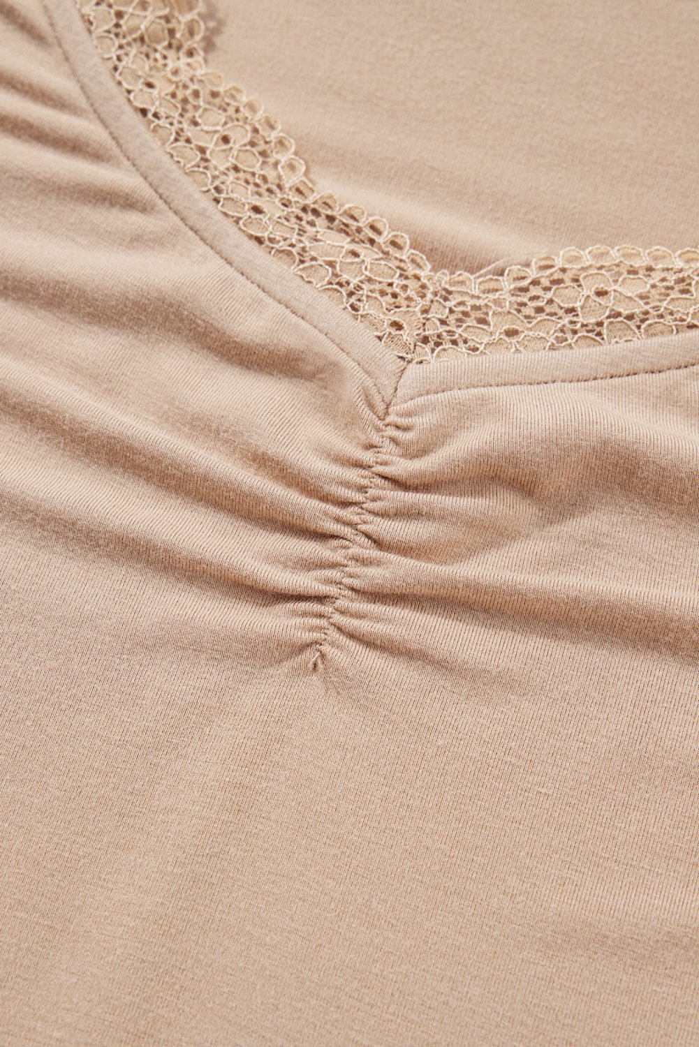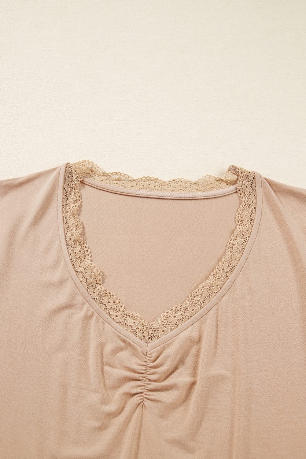 Features a V neckline with lace trim and ruched detail.