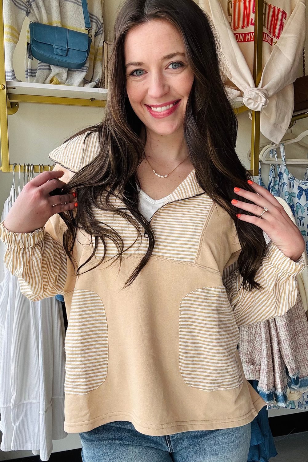 • The striped patchwork adds chic detail to this pullover top.