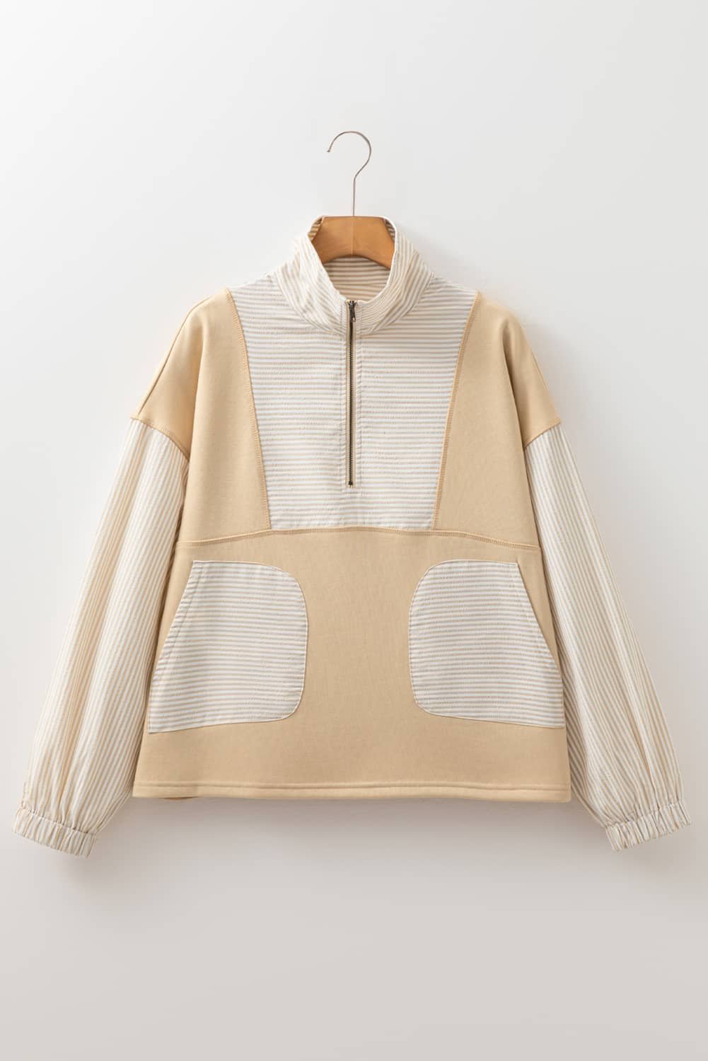Be the first to review “Smoke Gray Quarter Zip Striped Patchwork Drop Shoulder Loose Long Sleeve Top”