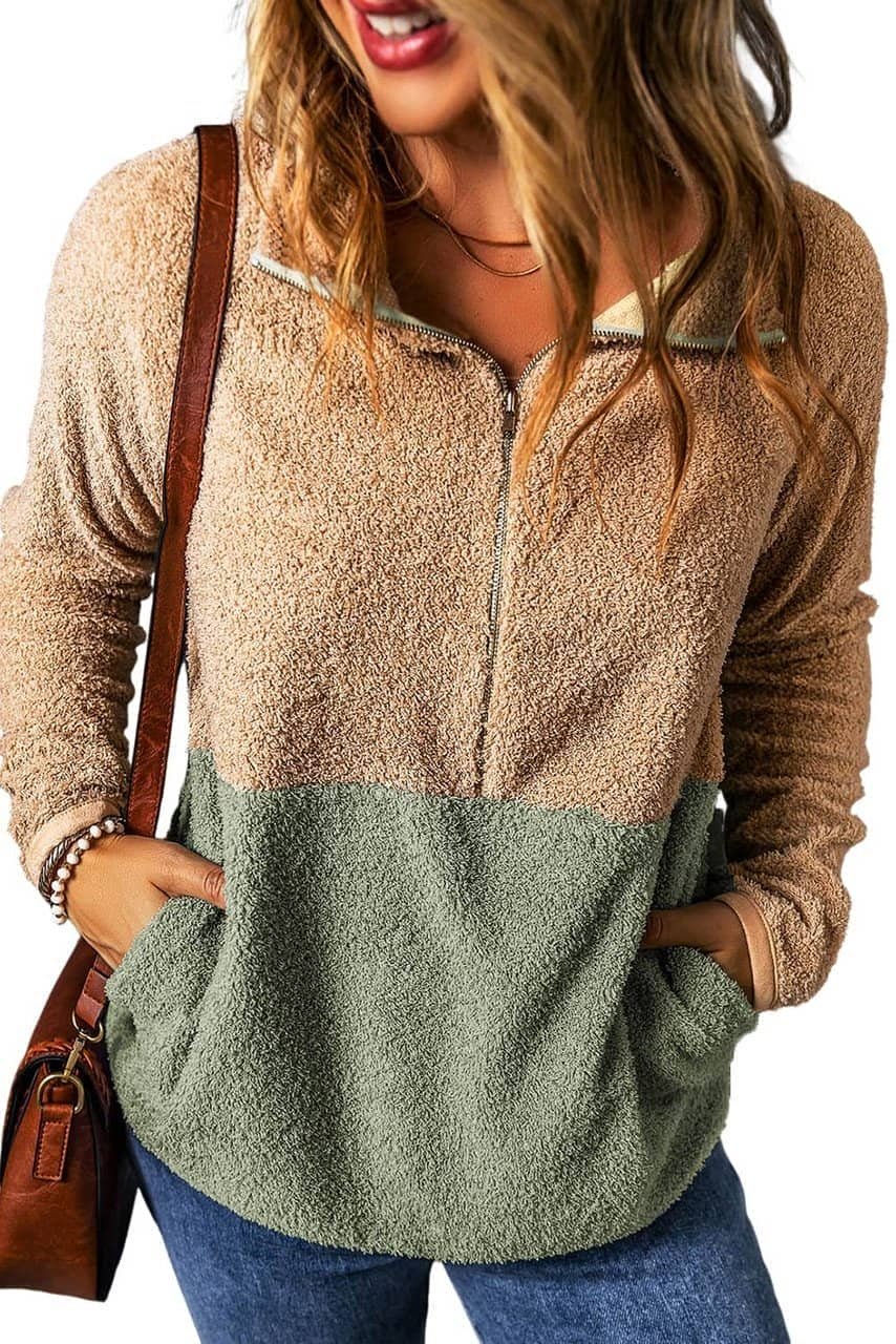 - Stay warm and stylish with our Two Tones Color Block Half Zip Fleece Sweatshirt