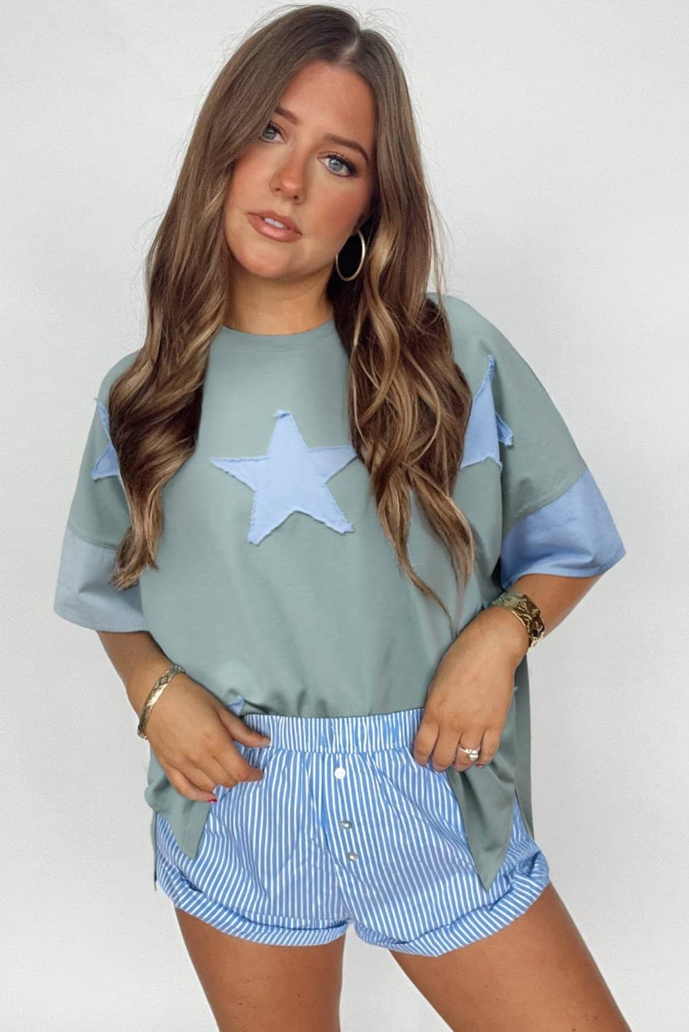 - Trendy oversize T-shirt features a frayed denim star patch for a unique and edgy look.