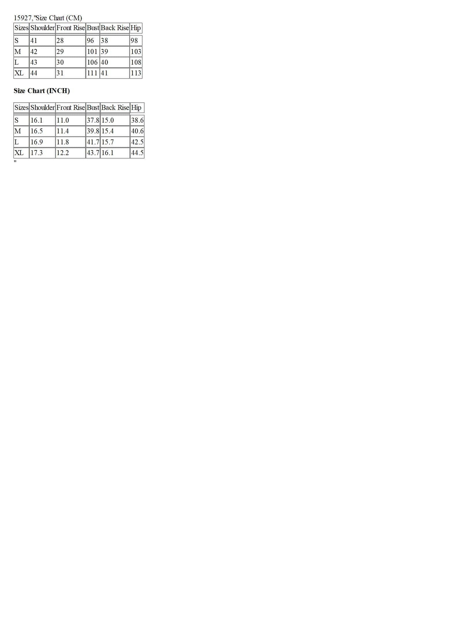 Sizes | Shoulder | Front Rise | Bust | Back Rise | Hip |