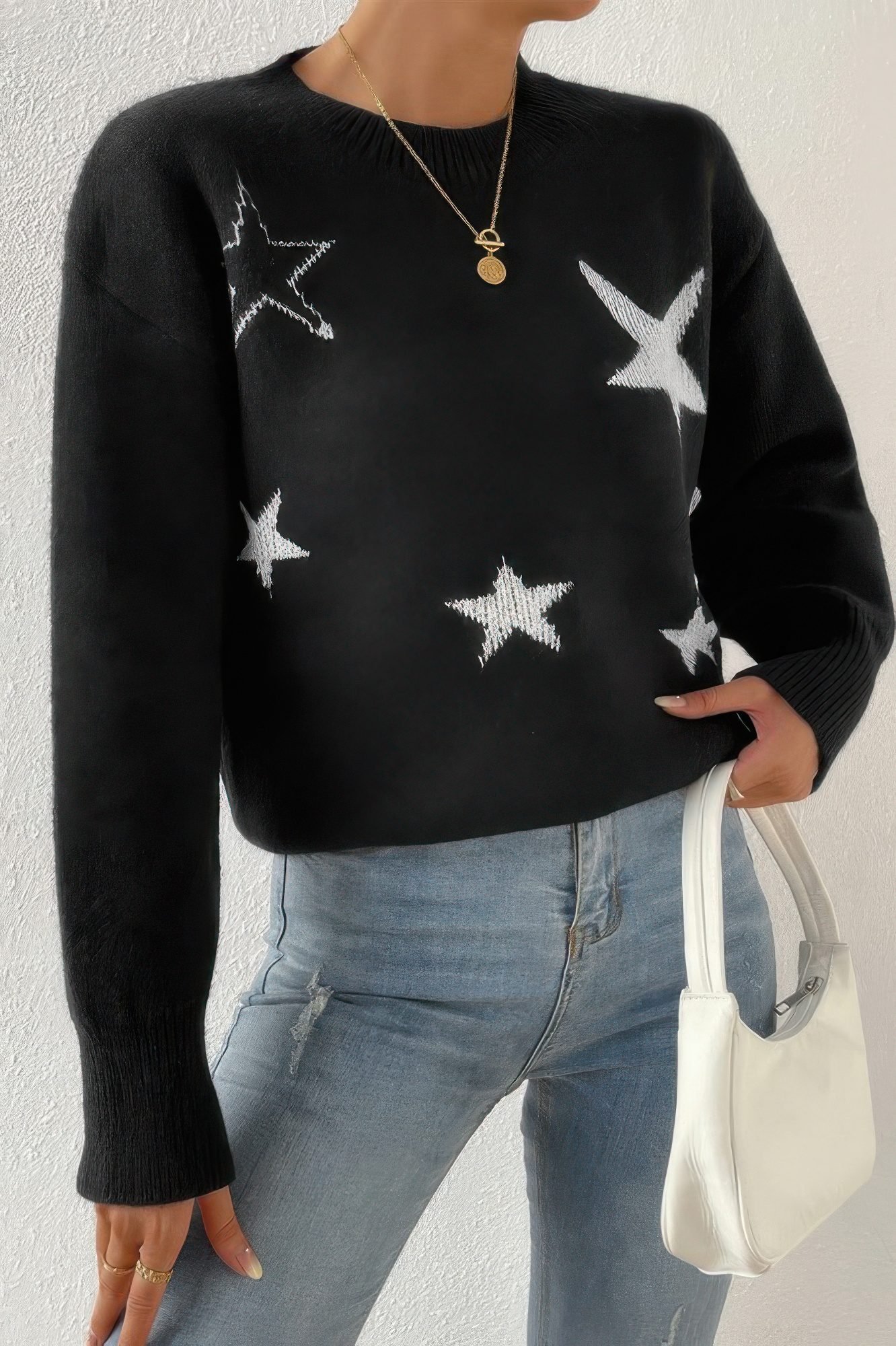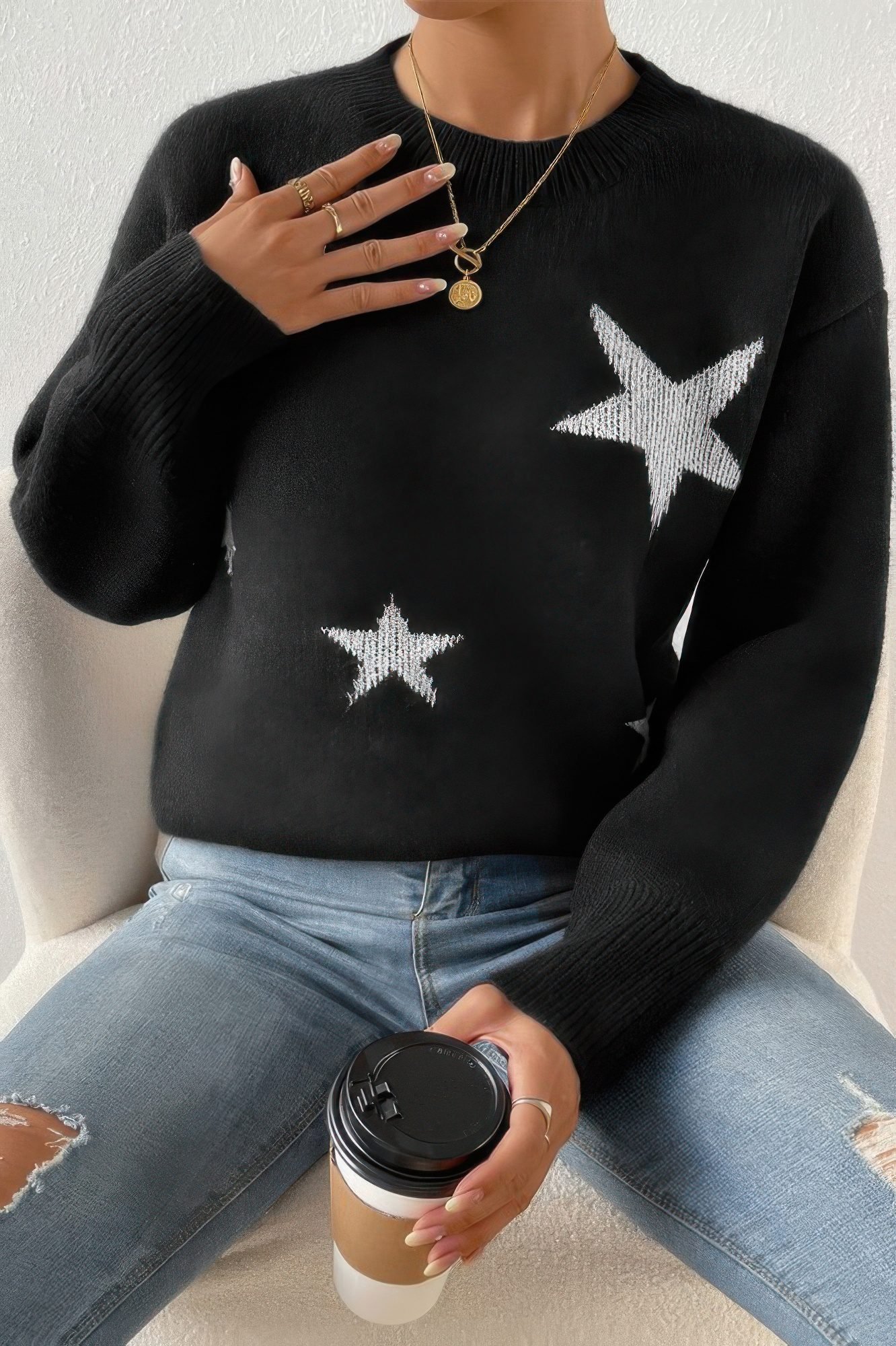 Product Description: Add playful charm to your wardrobe with this Star Print Knit Loose Fit Sweater, perfect for cozy days with a touch of style. Made from breathable, lightweight polyester, this sweater features a V-neckline, star print, and a relaxed fit that pairs perfectly with your favorite denim or leggings. Product Details: Material: 100% Polyester for warmth and softness V-neckline with color block and stripe accents Relaxed, loose fit for everyday comfort Star print adds playful style Suitable for casual outings, holidays, or daily wear Size Guide: For accurate sizing guidance, please review our size chart available on the website. Shipping and Returns: Fast Shipping: We offer speedy delivery to your doorstep. Hassle-Free Returns: If you’re not completely satisfied, our flexible return policy ensures your peace of mind.