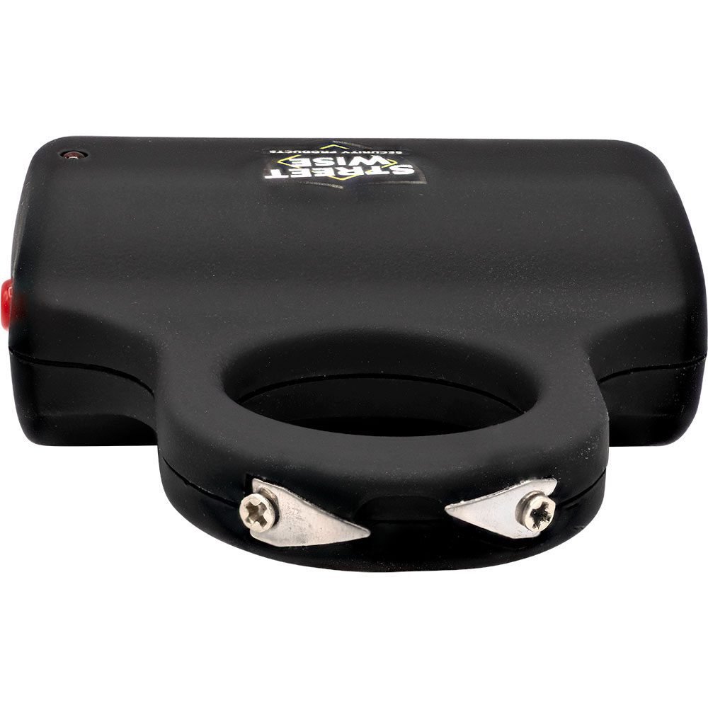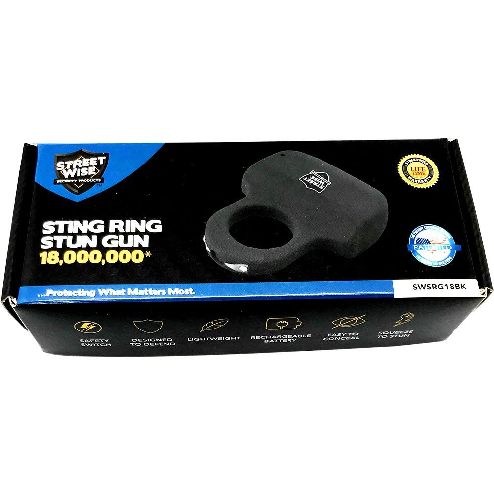 Streetwise Security Products introduces their newest design in personal protection, the Sting Ring 18,000,000* Stun Gun. This revolutionary patented model separates itself from all other stun guns on the market today and has become one of our best sellers and a favorite among women. The base of the unit can be concealed in the palm of your hand exposing only the top of the Sting Ring. The rounded base feels natural in your hand, and when gripped firmly it’s nearly impossible for an attacker to take it from you. The Squeeze-N-Stun Technology could save your life by saving you valuable seconds when defending yourself in a panic situation. Rather than having to fumble around looking for the right buttons to push you simply turn off the safety and tighten your grip to activate the unit and stun your attacker! Although this item can be easily carried in a pocket or purse or concealed in the palm of your hand if you prefer a holster see item PFHCH below under related products. FEATURES Patented Design: There is no other stun gun like this in the world. The improved design makes it the easiest to carry, conceal, and use. Designed to Defend: The ease of use, concealability, and strong electric current make this model one of the best new stun gun models on the market today! Squeeze-N-Stun Technology: When it comes to protecting yourself, saving seconds can save your life! In a panic situation, the stun gun can be activated quickly and easily by simply squeezing it. This new technology saves you valuable time by not having to fumble around for the right button to push and your tight grip around the unit prevents it from being knocked out of your hand. Concealed by Your Hand: The base of the unit is concealed inside your closed fist, leaving only the ?Sting Ring? exposed. Your attacker will never know you are carrying a stun gun giving you the element of surprise. Small & Lightweight: Eliminates the need to carry a heavy, bulky self-defense product. Ideal for those exercising outdoors or just walking to and from your car. Safety Feature: To prevent accidental discharge, the Sting Ring features a safety switch. Rechargeable: The USB charging cord (included) plugs into your personal block charger or USB car charger. Lifetime Warranty: The Sting Ring is made by Streetwise Security Products – the leader in the personal protection industry and features a lifetime warranty. See the enclosed instructions for complete details. Dimensions: 3? x 2 3/8? x 1? CONTENTS Streetwise Sting Ring 18,000,000* Stun Gun USB Charging Cord (Block charger not included) Instructions *Actual Voltage output is difficult to measure and verify, but this unit compares to other brands that claim to be 18,000,000 or more volts.