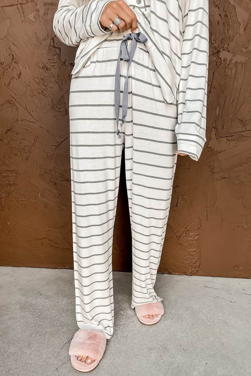 This pajamas set is a two-piece set that includes a long sleeve buttoned top and a loose pants