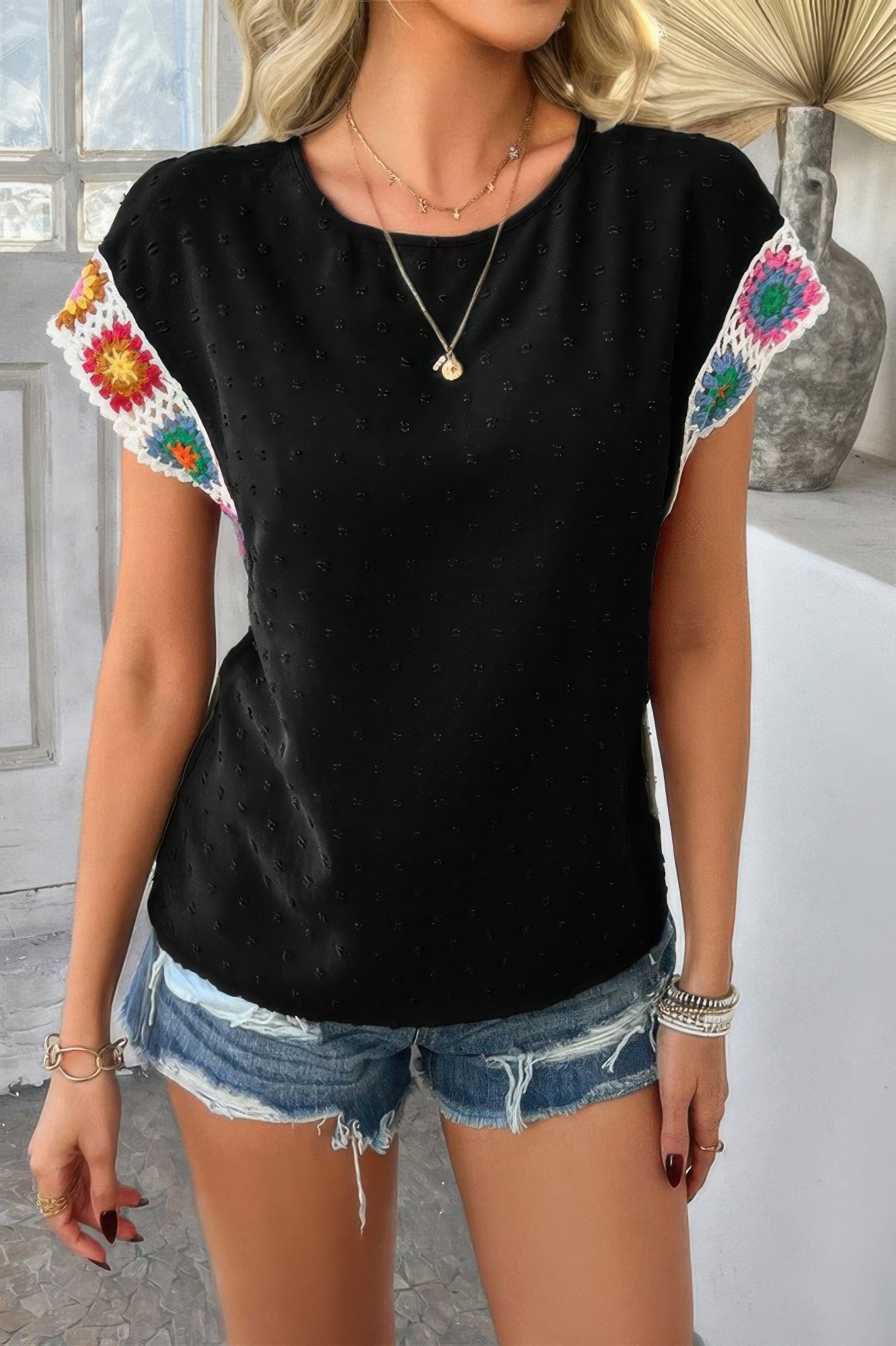 Swiss Dot Crochet Patchwork Short Sleeves Shirt