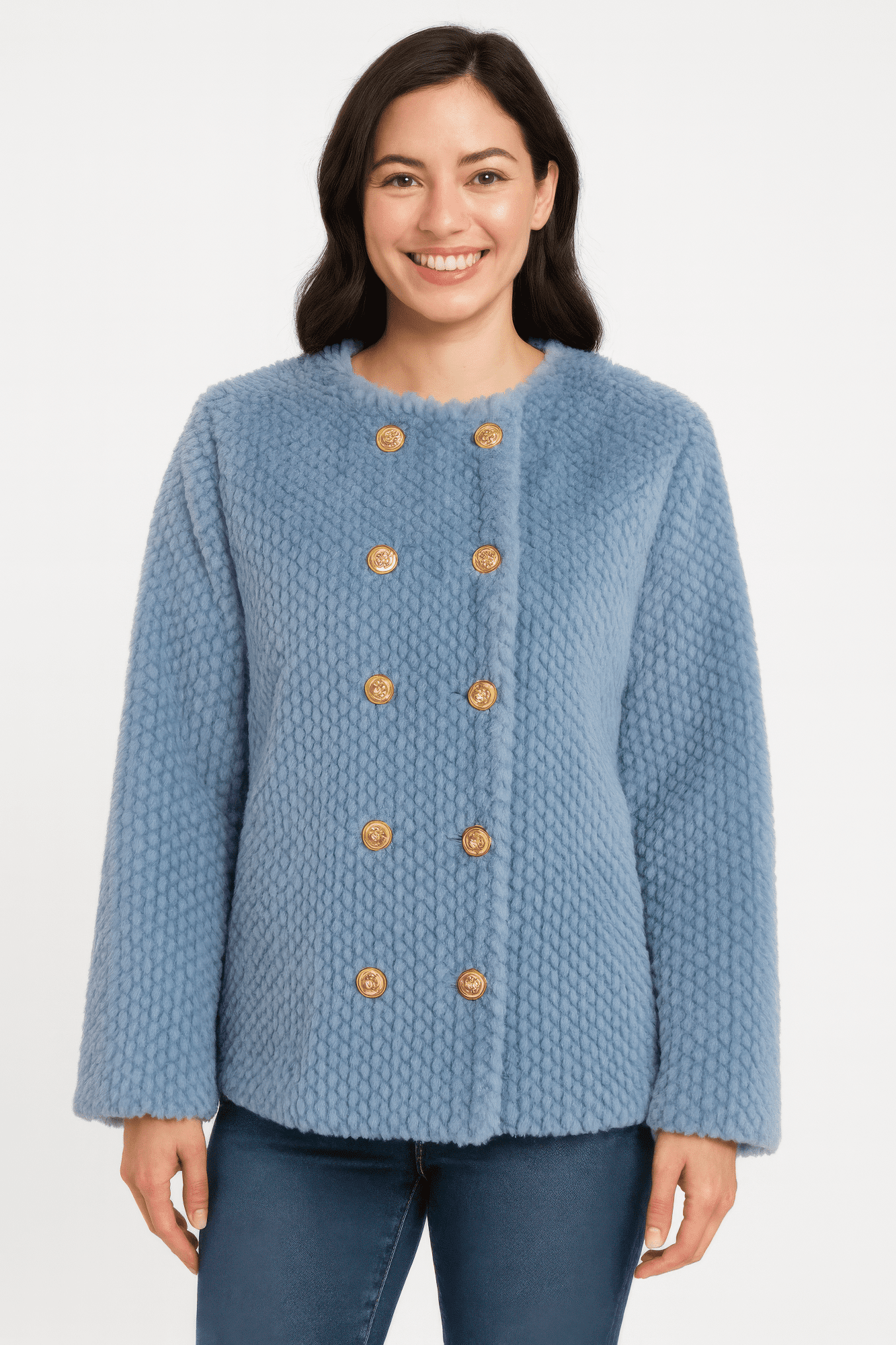 Wrap yourself in cozy sophistication with the Textured Double-Breasted Faux Shearling Jacket. Crafted from plush faux shearling in a rich ivory tone, this jacket features a tactile, diamond-like texture that feels as good as it looks. The double-breasted front is accented with luxe gold-tone buttons, offering a refined finish to the relaxed silhouette. Its round neckline and streamlined cut make it easy to style over your favorite denim, trousers, or layered knits. Perfect for chilly days when you want to stay warm without compromising on elegance.