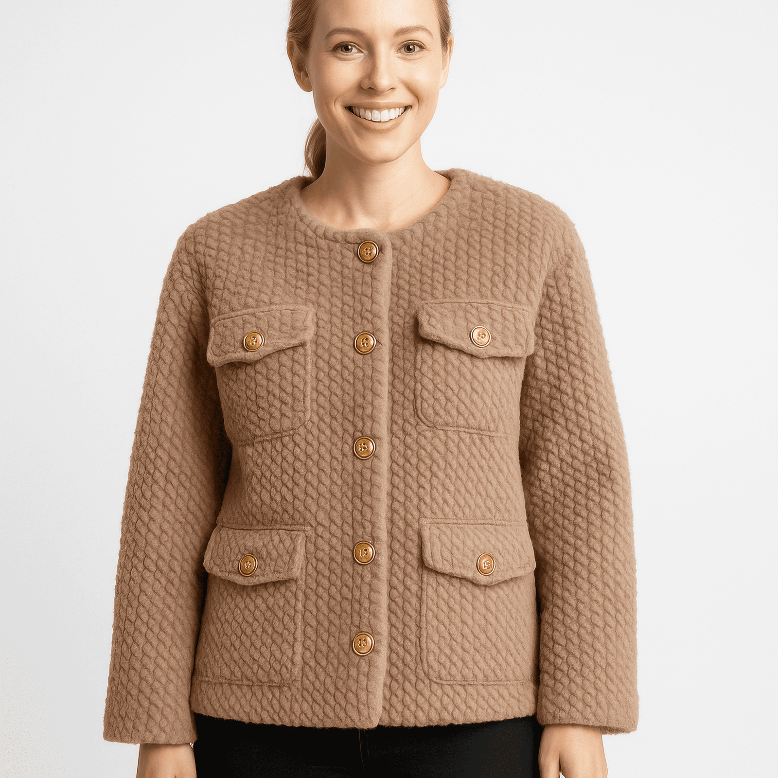 Classic structure meets cozy texture in the Textured Woven Button-Front Jacket — a sophisticated layer that brings polish to any outfit. Designed in a warm, neutral tone, this jacket features a soft quilted-like weave that offers both comfort and refined style. Gold-tone buttons and four front flap pockets provide timeless tailoring details, while the round neckline and clean silhouette make it easy to pair with everything from denim to trousers. Lightweight yet structured, this versatile jacket is perfect for cool-weather layering or elevating your everyday wardrobe.