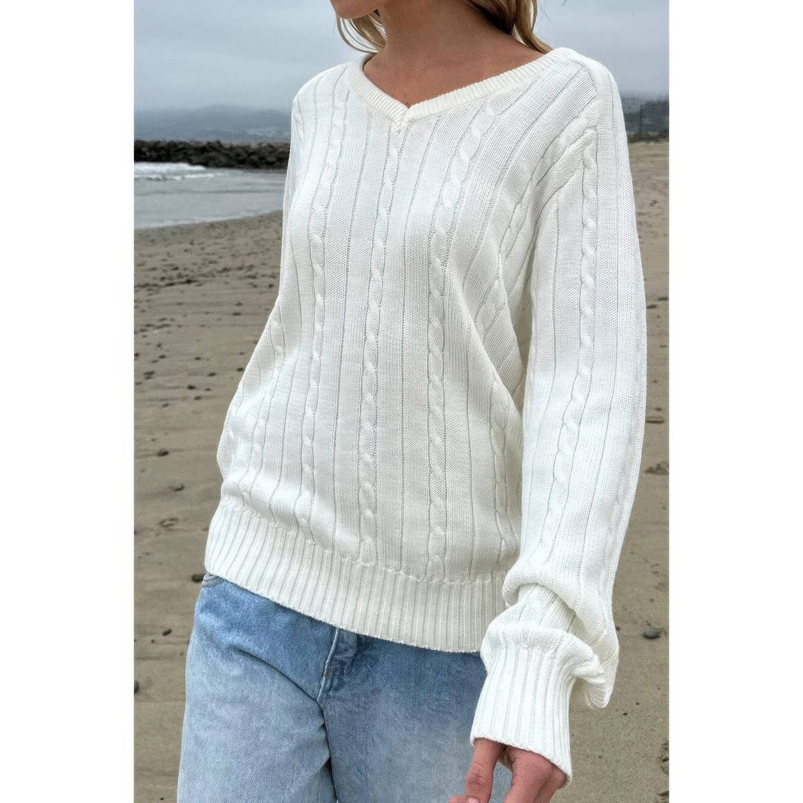 Product Description: Effortlessly chic, the V Neck Solid Long Sleeves Cable Knit Sweater brings timeless comfort to your wardrobe. Made from a soft viscose-polyamide blend, it delivers gentle warmth with a smooth finish. The flattering V-neckline adds a touch of femininity, while the cable knit pattern provides subtle texture. Its versatile design transitions easily from office hours to weekend outings. Pair with trousers or denim for an understated yet refined look. Product Details: 50% Viscose, 28% Polyester, 22% Polyamide Cable knit texture V-neck design for a flattering silhouette Soft and breathable material Perfect for everyday wear Size Guide: For accurate sizing guidance, please review our size chart available on the website. Shipping and Returns: Fast Shipping: We offer speedy delivery to your doorstep. Hassle-Free Returns: If you’re not completely satisfied, our flexible return policy ensures your peace of mind.