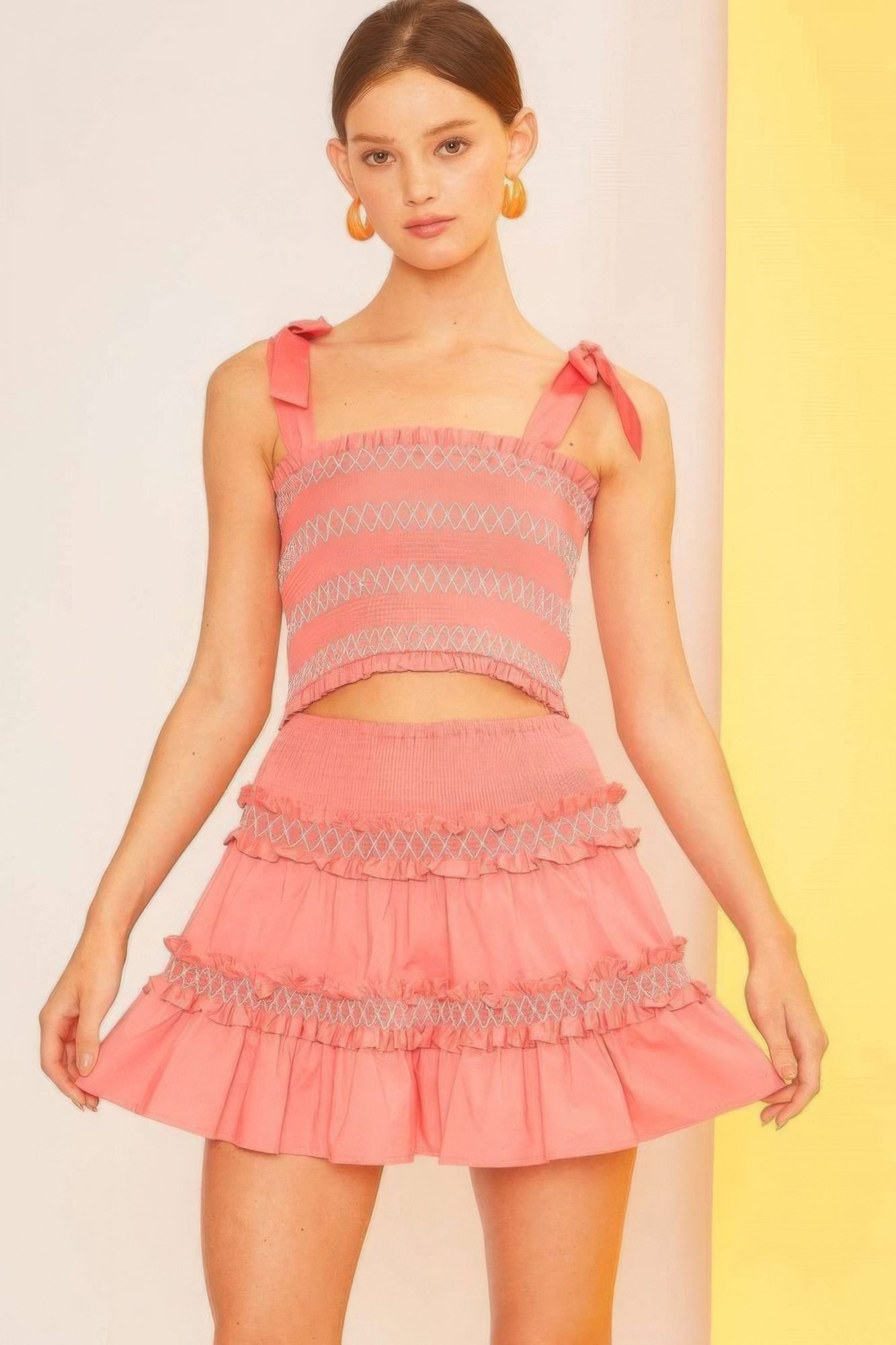 Introducing our Waist Smocking Ruffle and Shirring Mini Skirt, a playful and stylish addition to your summer wardrobe. Crafted from a blend of 97% cotton and 3% spandex, this skirt offers both comfort and stretch. The waist smocking detail ensures a flattering fit, while the ruffle and shirring accents add a touch of femininity. In a vibrant coral hue, this mini skirt is perfect for adding a pop of color to your summer ensemble.Key Features:- Available Sizes: S, M, L- Design: Mini skirt with waist smocking, ruffle, and shirring details.- Fabric: Made from 97% cotton and 3% spandex for comfort and stretch.Product Details:- Flattering Fit: The waist smocking detail ensures a comfortable and flattering fit.- Feminine Detailing: The ruffle and shirring accents add a playful and feminine touch to the skirt.- Vibrant Coral Color: In a striking coral hue, this mini skirt is perfect for adding a pop of color to your summer wardrobe.Why Choose Waist Smocking Ruffle and Shirring Mini SkirtOur Waist Smocking Ruffle and Shirring Mini Skirt offer the perfect blend of style and comfort, making it a versatile piece for various summer occasions. Whether you’re heading to a beach party, brunch with friends, or a casual outing, this skirt will keep you looking chic and feeling confident.Ideal Occasions:Perfect for everyday wear, beach outings, picnics, or any summer event where you want to stay stylish and comfortable.