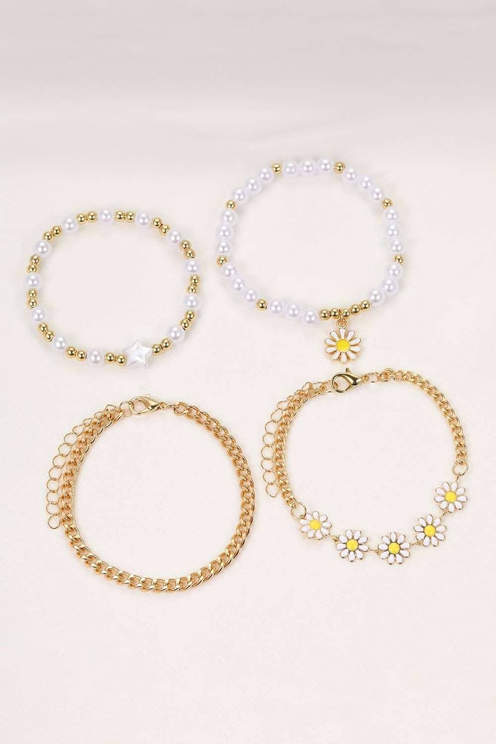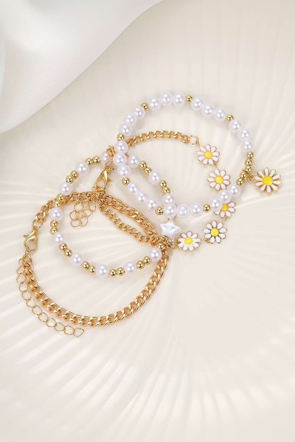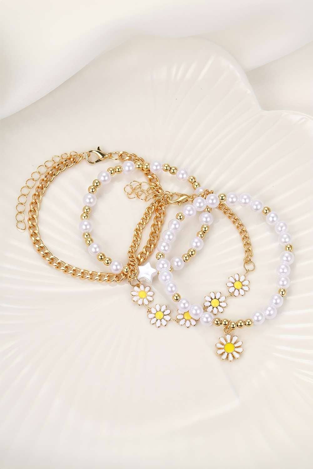 White 4Pcs Daisy Pearl Beaded Chain Bracelet Set