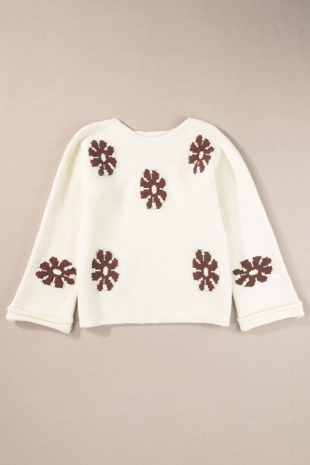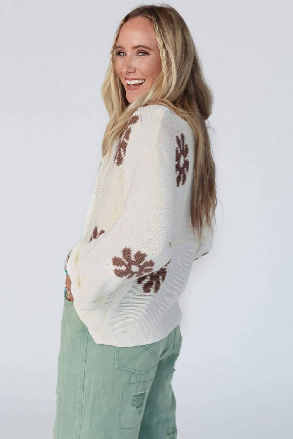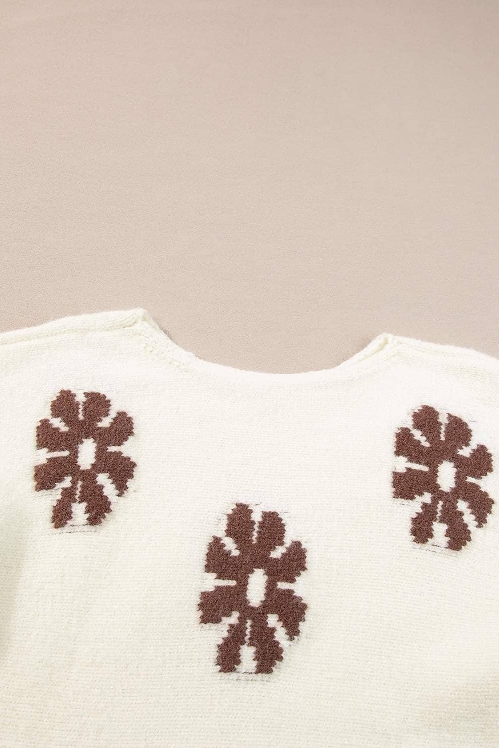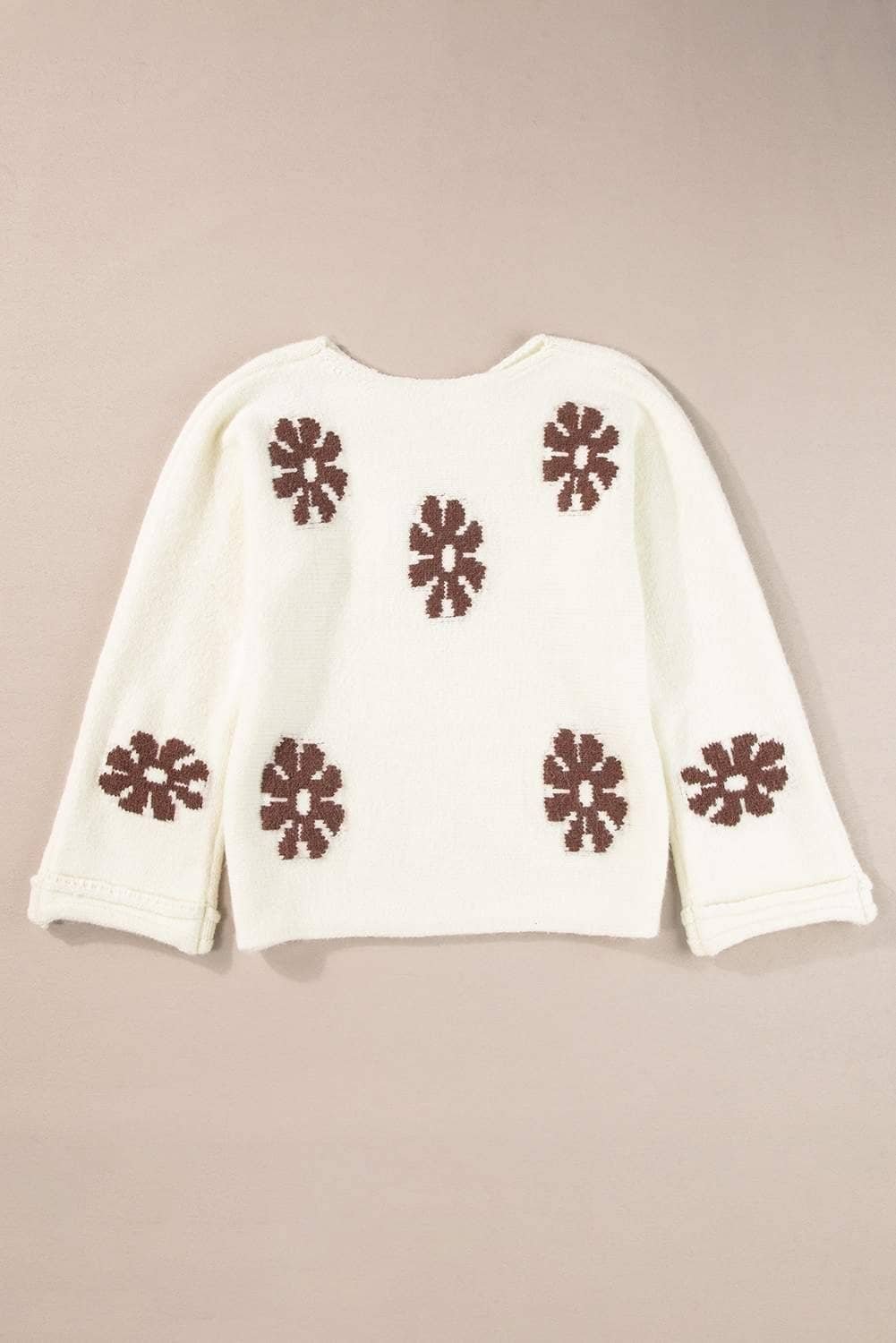 The sweater features a beautiful floral pattern.