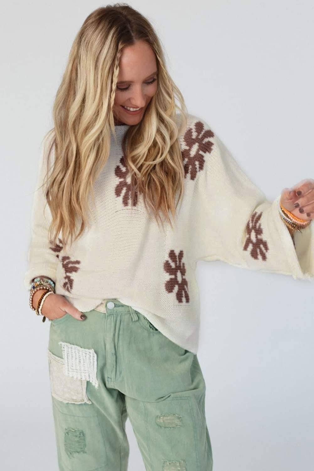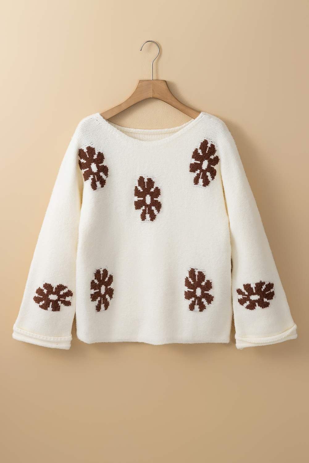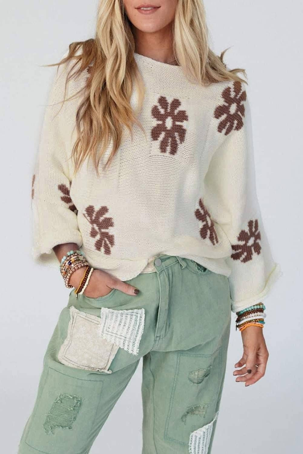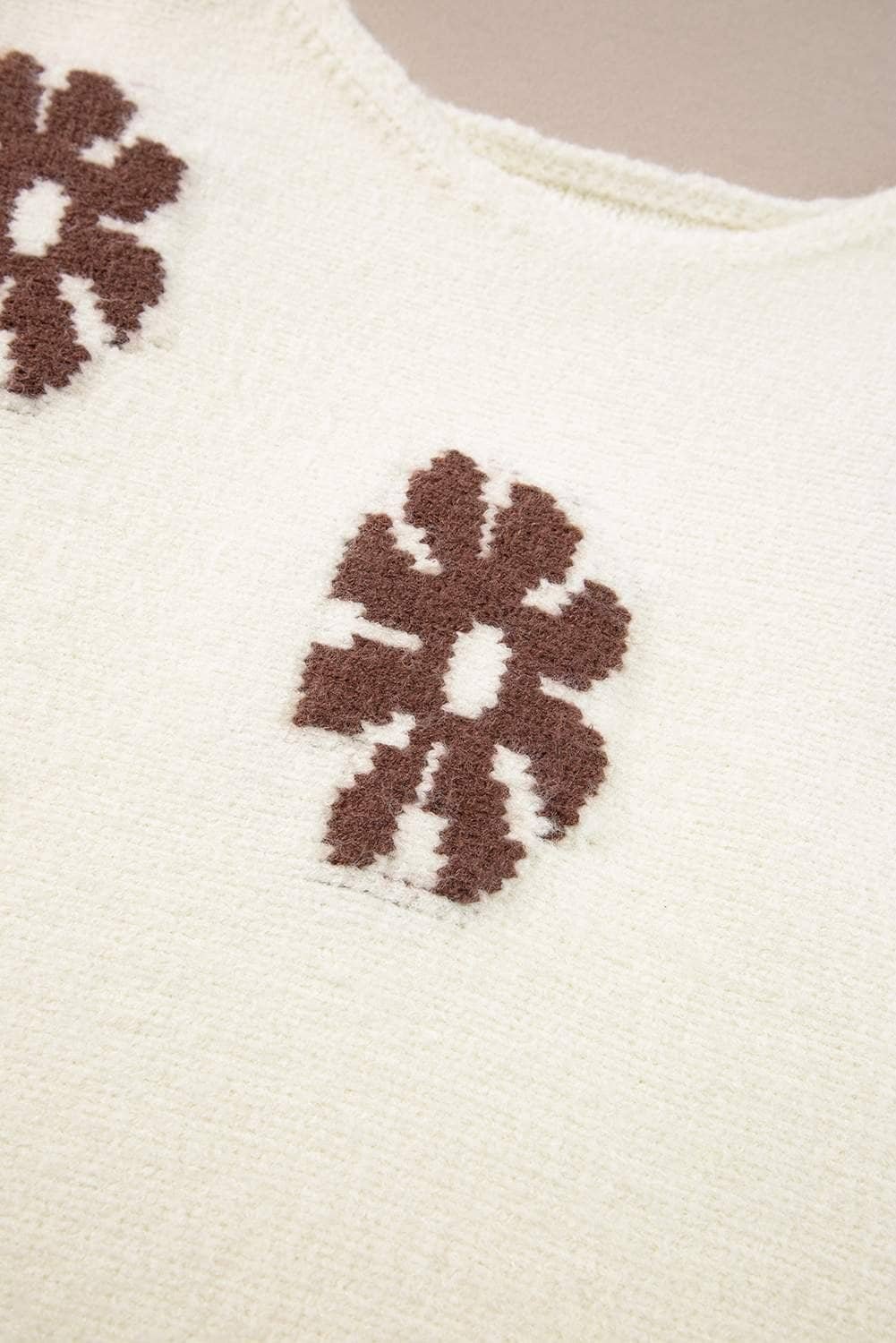 The sweater features a beautiful floral pattern.