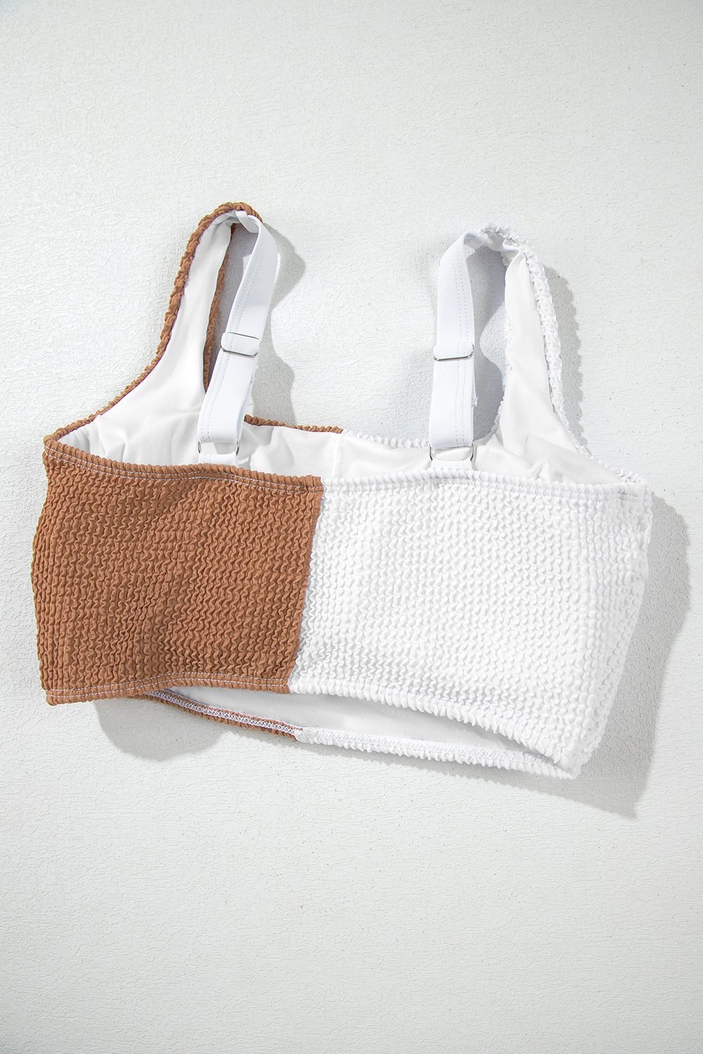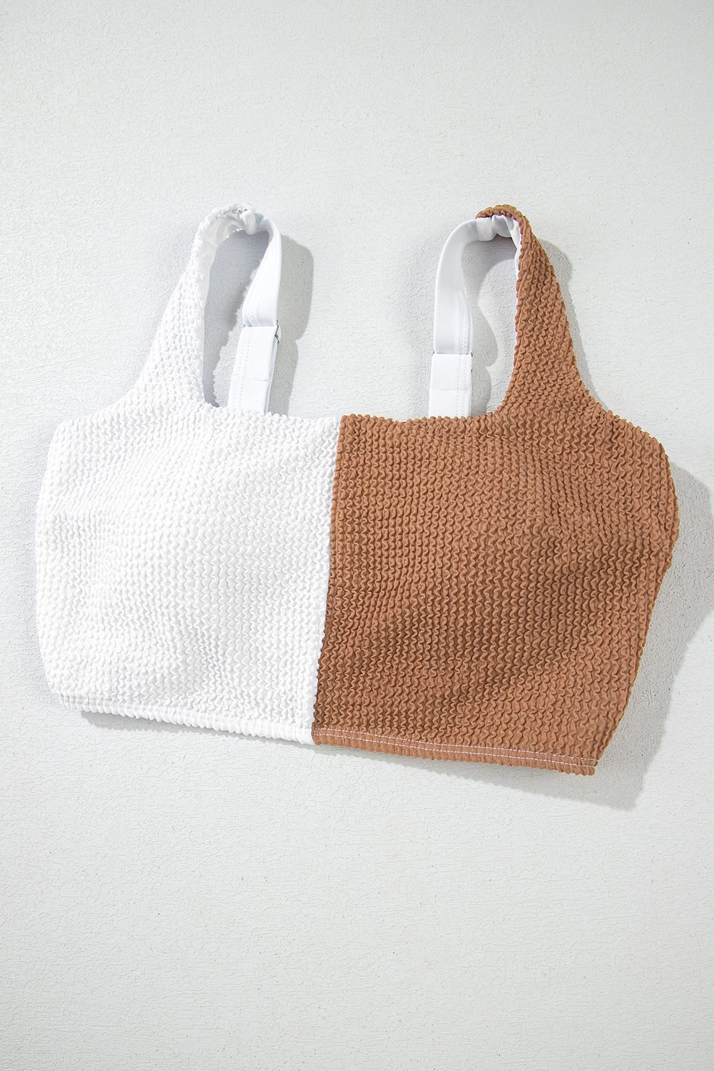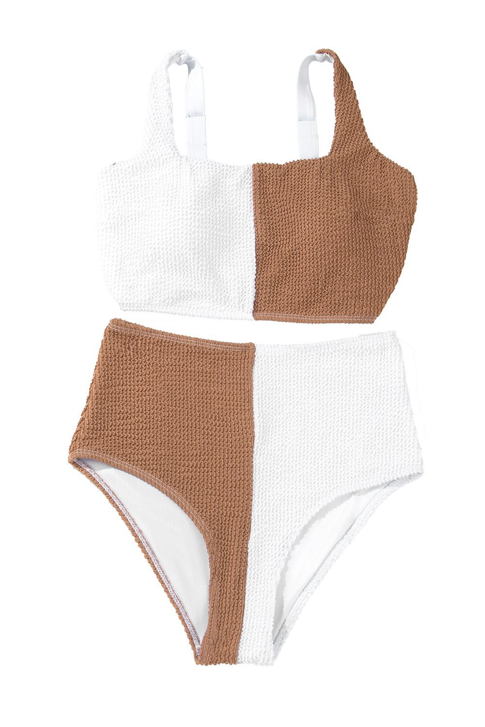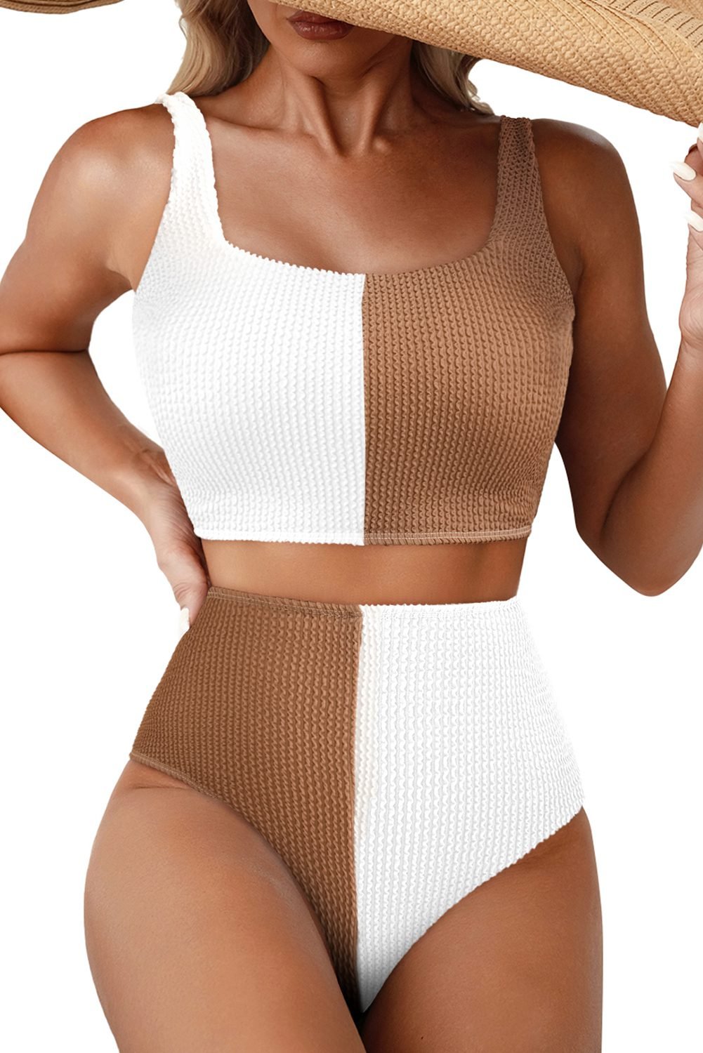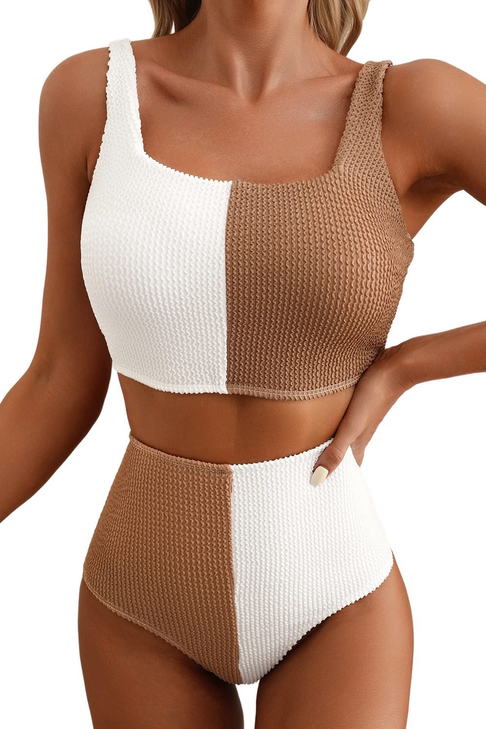 Stylish colorblock bikini set features a square neck design, perfect for a modern swimwear look.