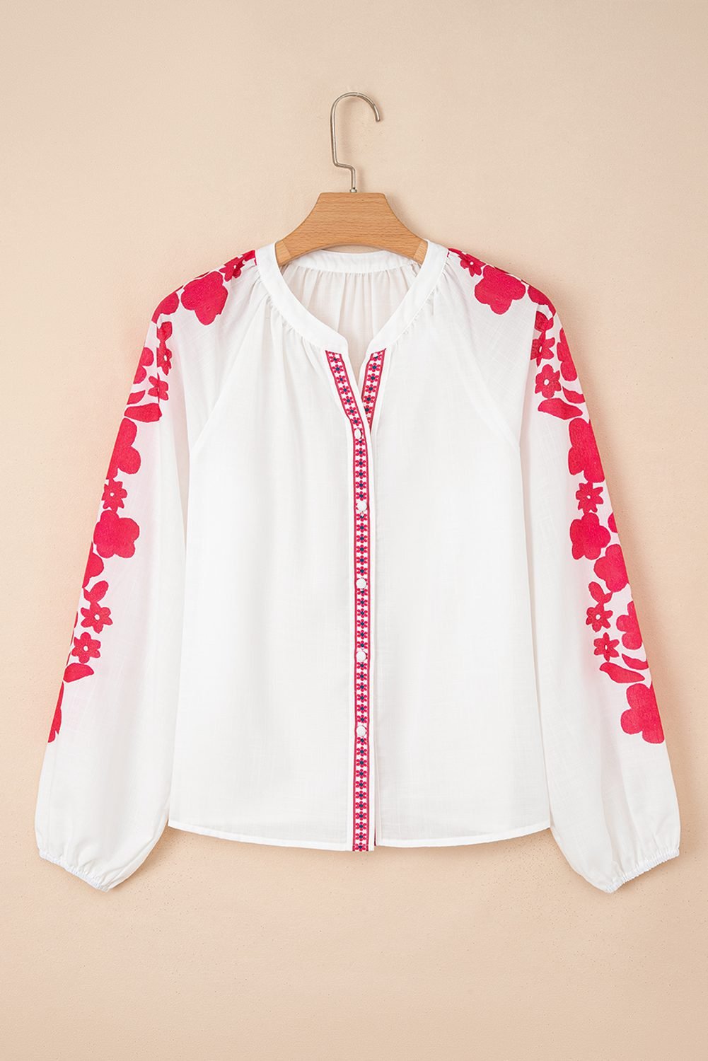 White Floral Embroidered Puff Long Sleeve Casual Shirt