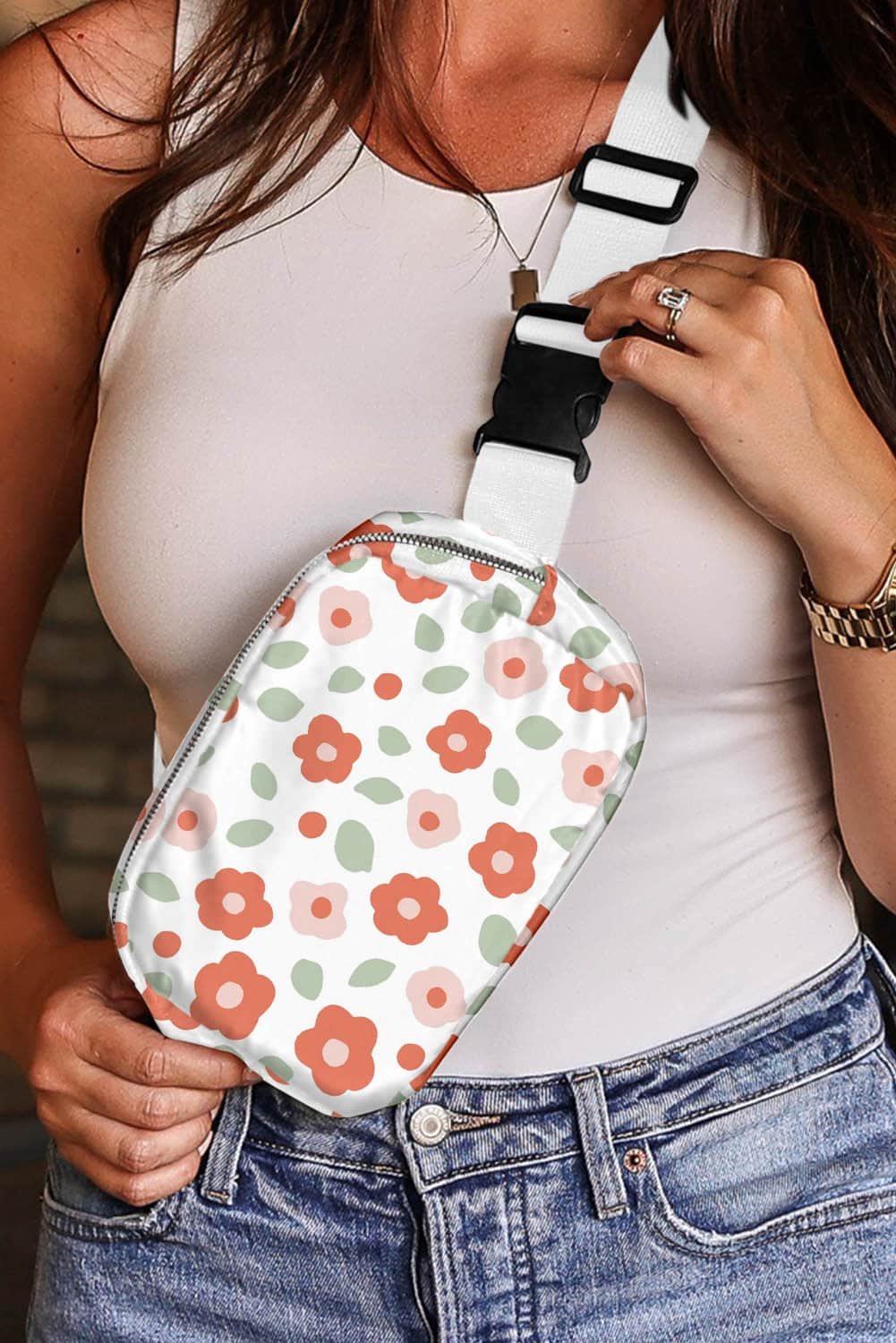 White Floral Print Buckle Wide Belt Zipper Crossbody Bag