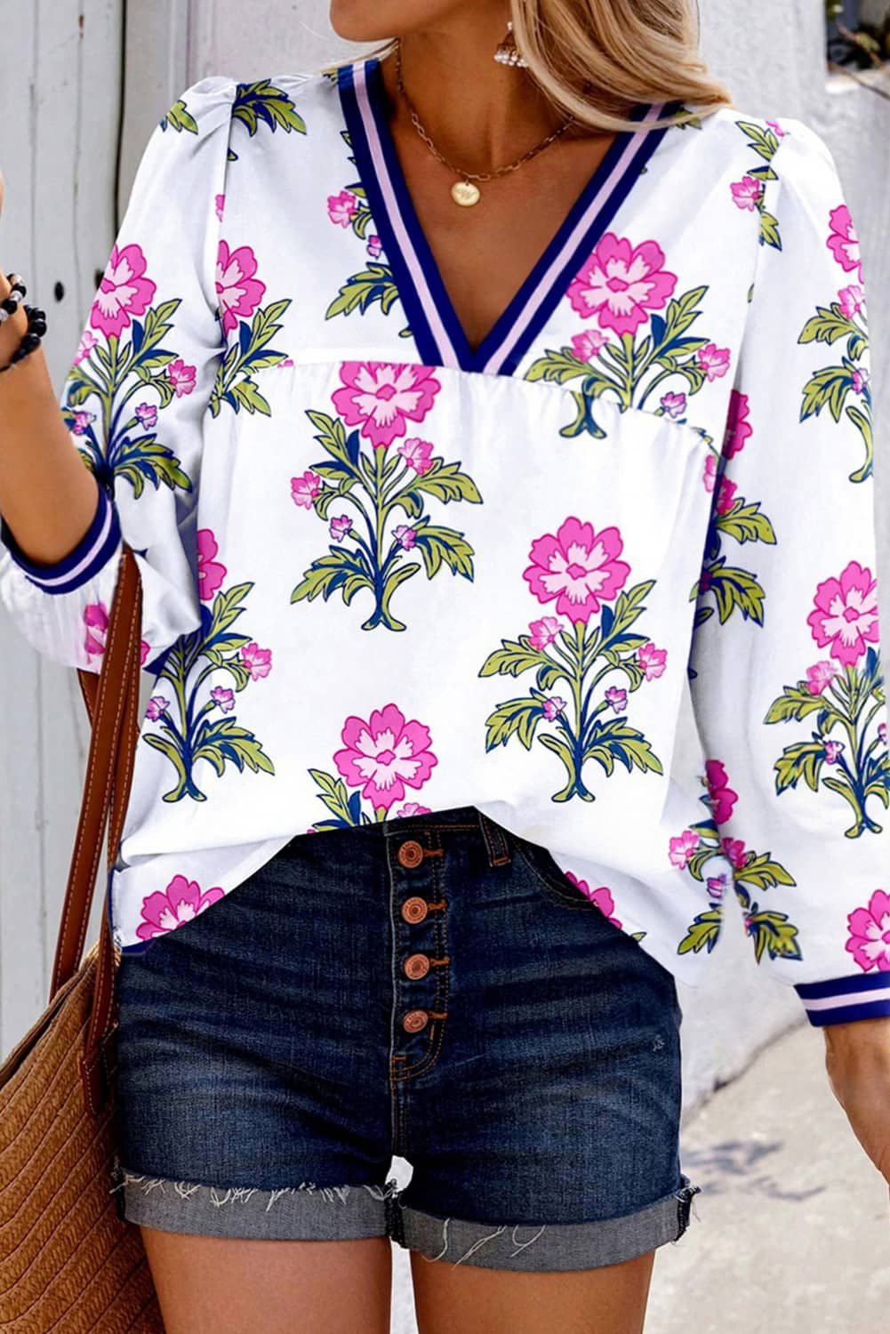 Be the first to review “White Floral Print Striped V Neck Blouse”
