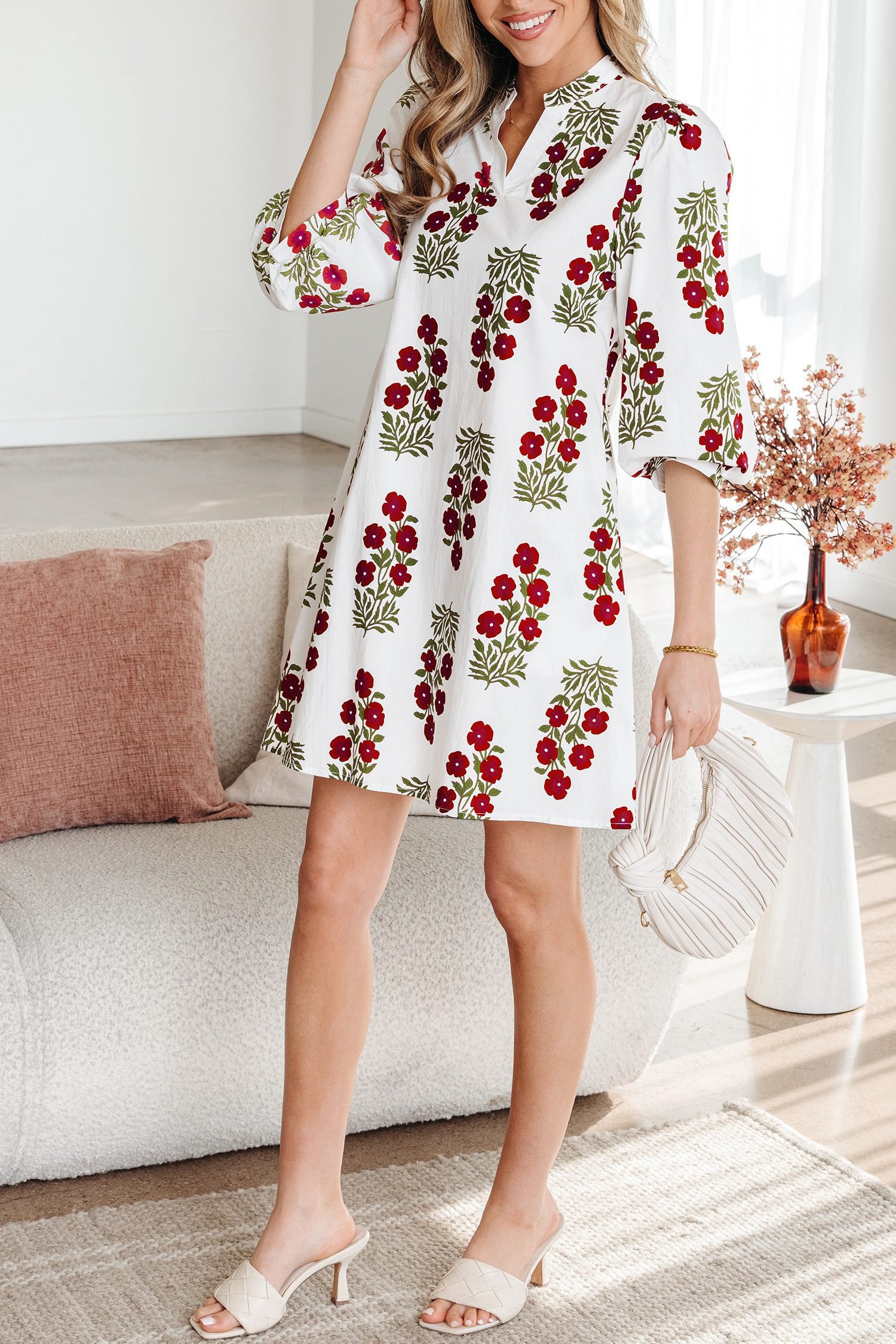 This casual short dress has a v neck, and puffy 3/4 sleeves.